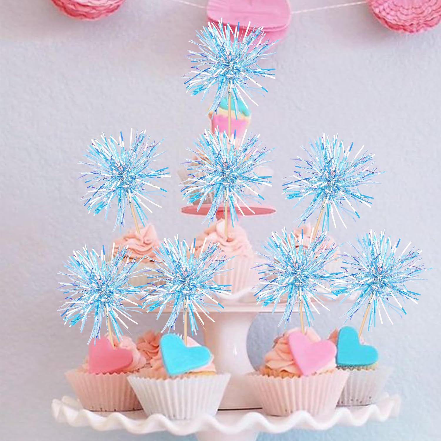 30 PCS Foil Firework Cupcake Toppers Happy Birthday Cupcake Toppers Sparkle Tinsel Flower Drink Stirrers Cocktail Fruit Toothpicks for Valentine's Day Baby Shower Party Cake Decor Supplies Blue