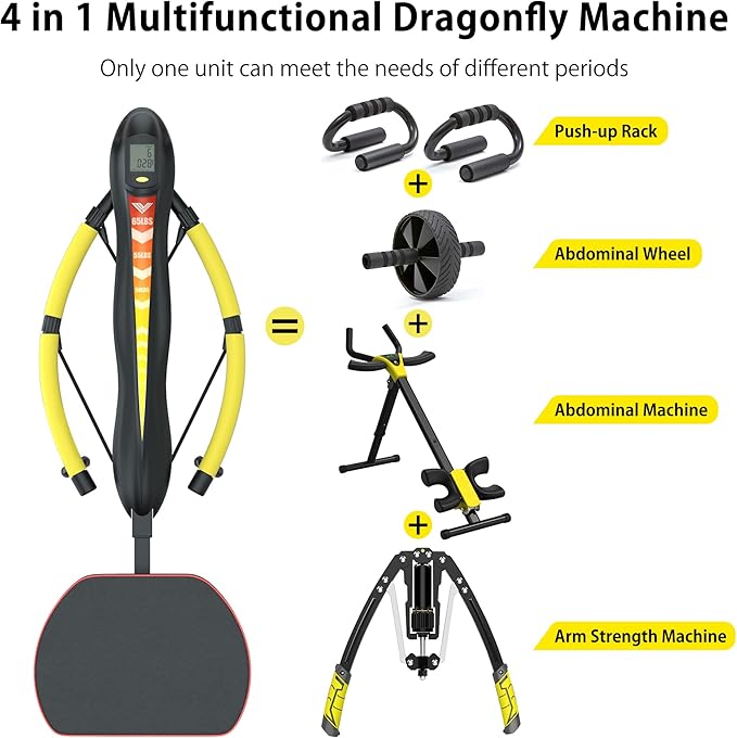 - 4-in-1 Multi-Function Fitness Equipment: This versatile dragonfly machine combines a push-up bar, ab roller, abdominal trainer, and muscle training armbar in one, catering to various workout preferences and ideal for all training enthusiasts