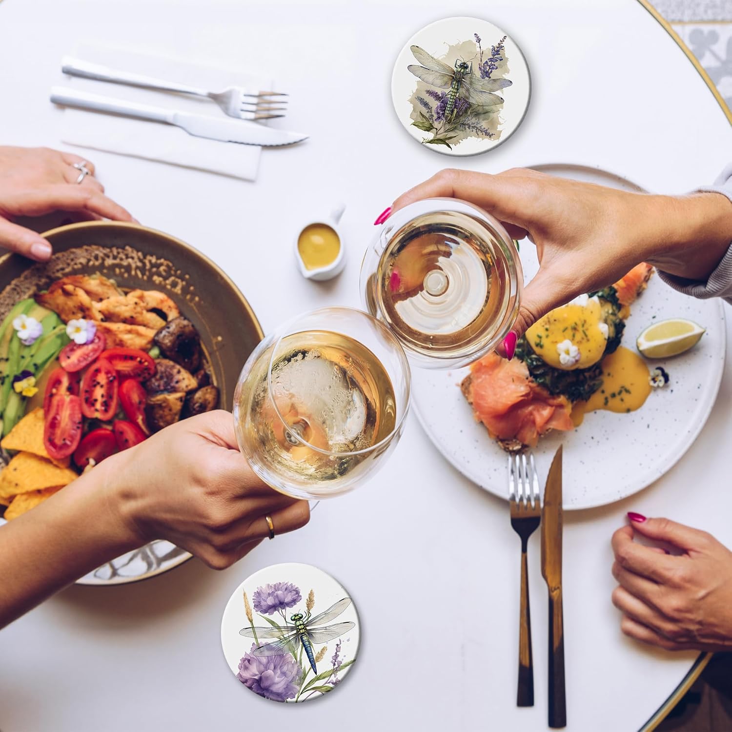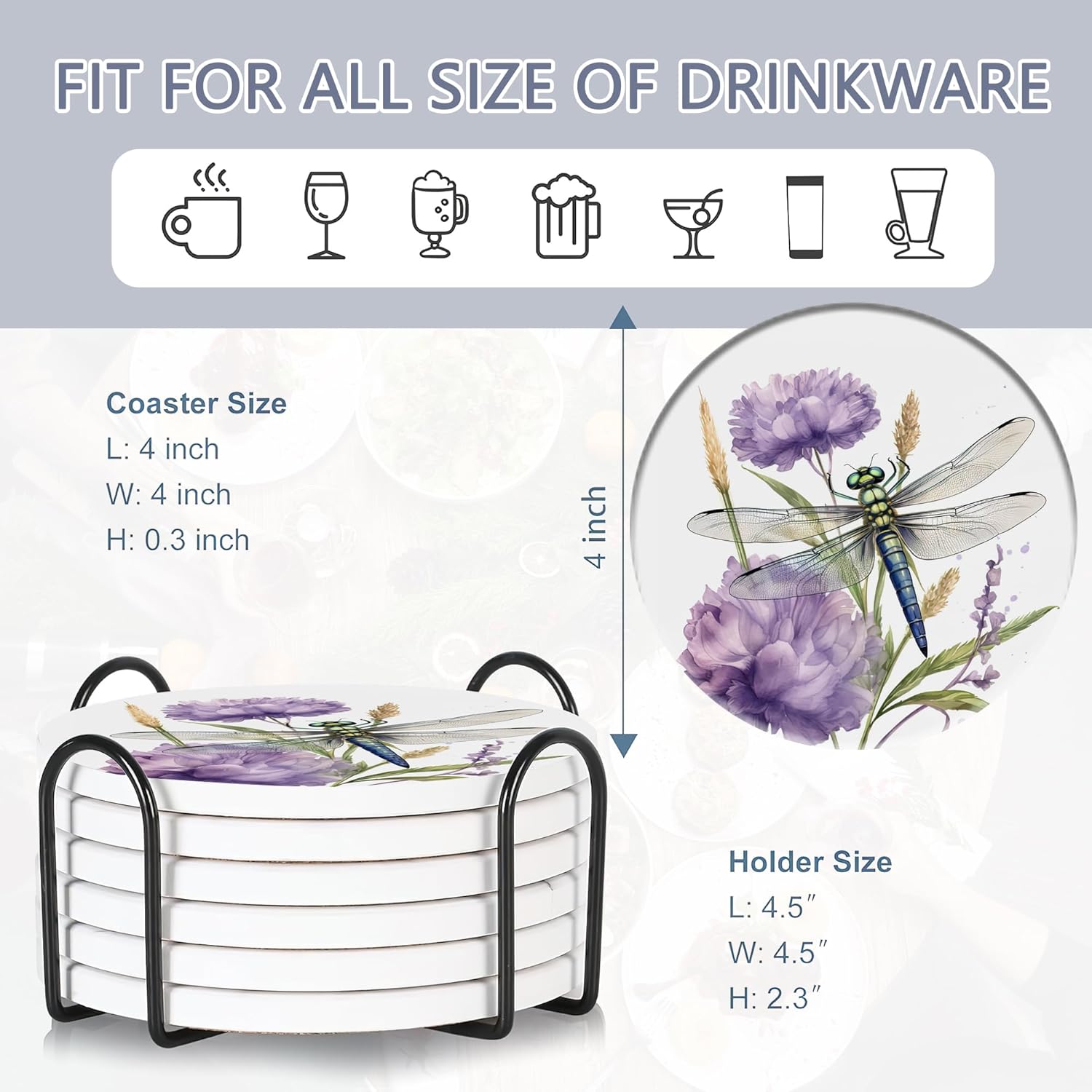 - Husiti Ceramic Coasters Set With Metal Holder: Keep Your Dining Table Stylish And Organized With This Set Of 6 4-Inch Round Coasters Featuring a Trendy Dragonfly Flower Pattern.