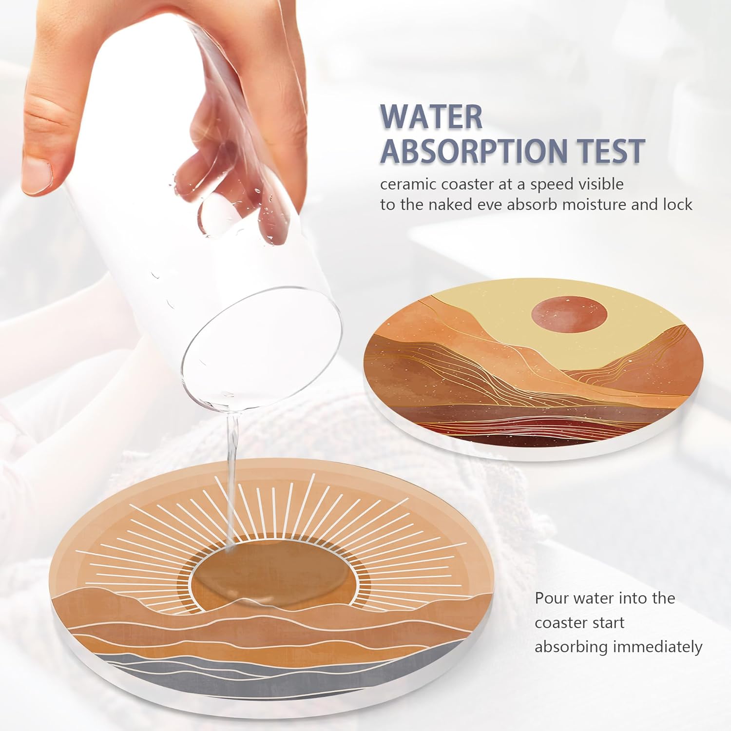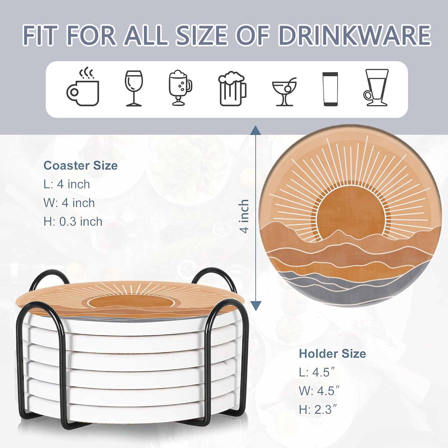 - Husiti Ceramic Coasters Set With Metal Holder: Keep Your Dining Table Stylish And Organized With This Set Of 6 4-Inch Round Coasters Featuring a Trendy Boho Mountain Sun Pattern.
