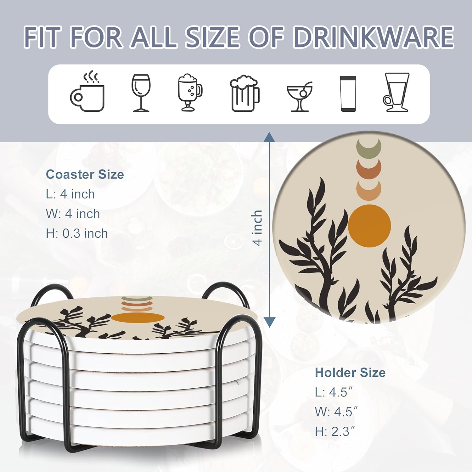 Drink Coasters Set of 6 with Holder, Abstract Boho Sun Leaves Absorbent Ceramic Coasters with Cork Base,Fit All Cups,Great Gift for Housewarming,Room Decor,Bar,Holiday Party