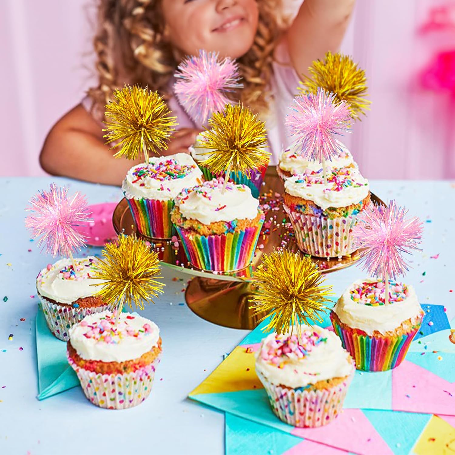 Gyufise 30Pcs Foil Firework Cupcake Toppers Sparkle Tinsel Cake Toppers Tinsel Drink Cake Decoration Cocktail Picks for Birthday Wedding Graduation Party Supplies Gold Pink
