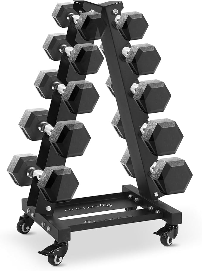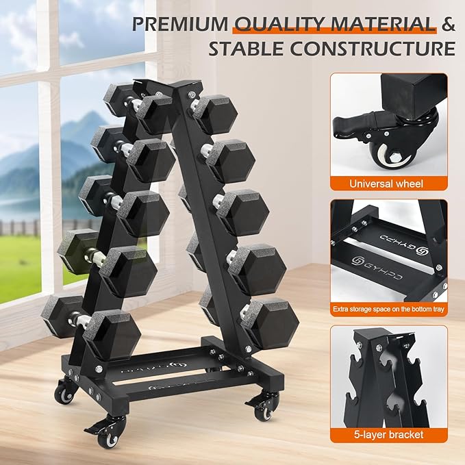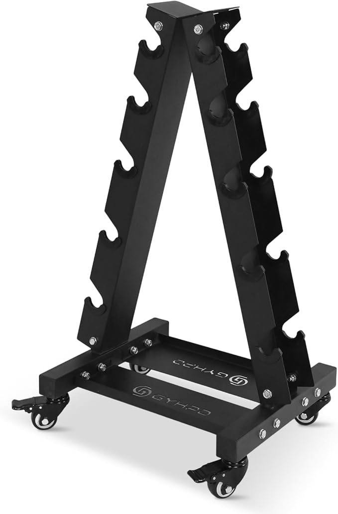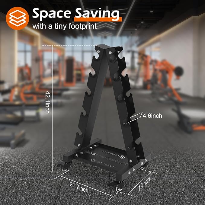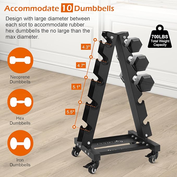 - 【700LBS 5 Tier Dumbbell Rack Stand】5-Shelf A-Frame Dumbbell Rack features a stable triangular design with adjustable chassis and wheels and a total weight capacity of 700LBS. Space saving and a smart choice for any home gym.