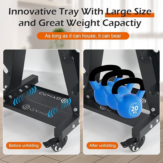 - 【Bottom Tray Design】Innovative tray provides more storage space for extra dumbbells and kettlebells, etc. You can expand or merge it to adjust the tray size according to your needs. Tray length is 17.3“, adjustable width is 11.4”-13.4”.