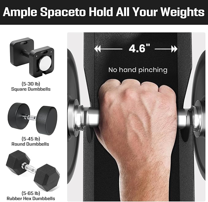 - 【4.6” Slot Spacing】Our 5-Tier Dumbbell Rack holds 10 dumbbells with 4.6” spacing between each slot, which we recommend for 5-65 lb. rubber dumbbells, hex dumbbells, round dumbbells, and more. NOTE: Neoprene and vinyl dumbbells do not fit!