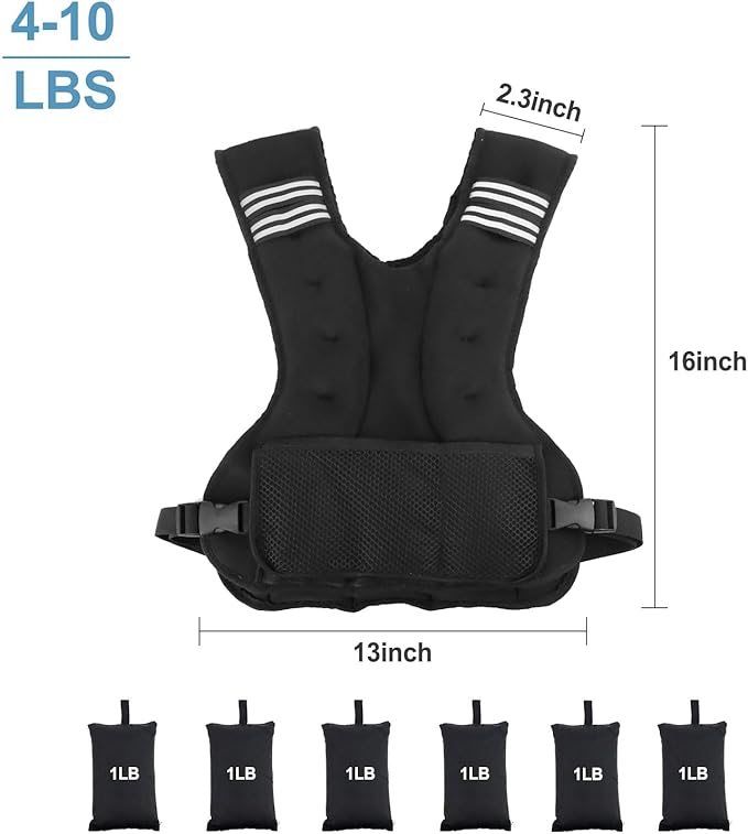 - ADJUSTABLE WEIGHT VEST - This adjustable weighted vest by HENKELION weighs in at 4 pounds by itself but reaches up to 10 thanks to the included six 1LB iron sand weight bags, allowing variable low impact resistance that strengthens your core and endurance no matter your exercise routine