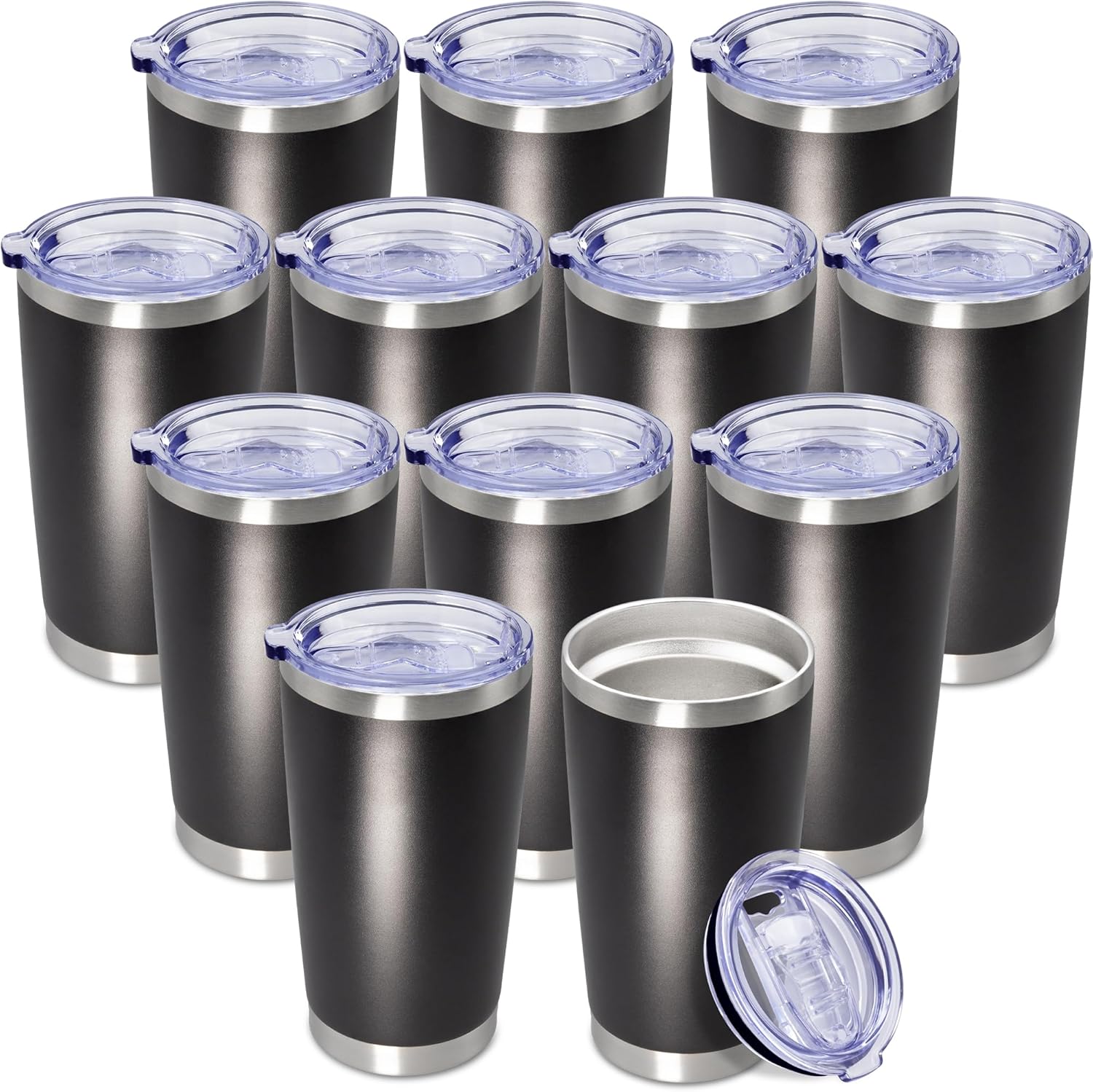 20 oz Tumbler Coffee Tavel Tumblers Bulk with Lid Stainless Steel Double Wall Vacuum Insulated Mug Powder Coated Cups fit Car Cupholder for Hot and Cold - Black, 12Pack