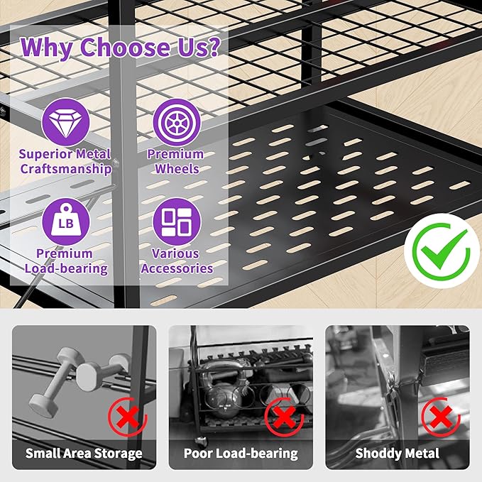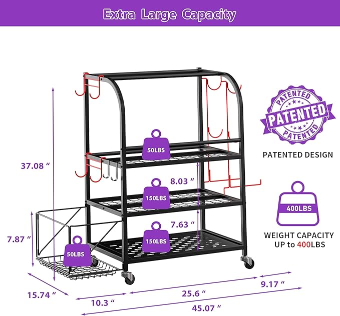 - [Easy Assembly & Family-Safe Design]: This kettlebell rack is used for easy assembly, with clear instructions and all necessary tools included, allowing for quick installation. There are no complicated steps, and even one person is capable of completing the assembly with ease. Additionally, this weight stand is designed to ensure the safety of children and pets. Even if bumped into, the sturdy all-metal structure and lockable wheels are capable of preventing the rack from moving or tipping over, providing extra peace of mind for families