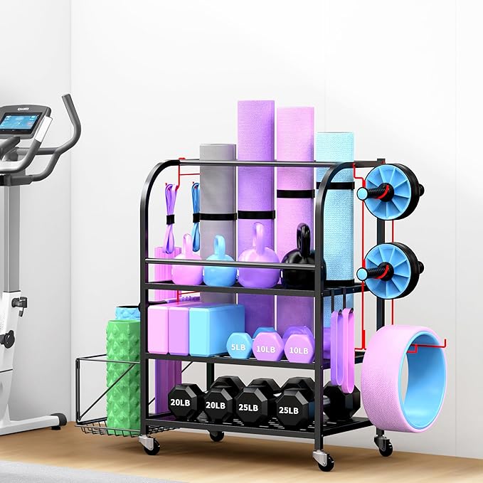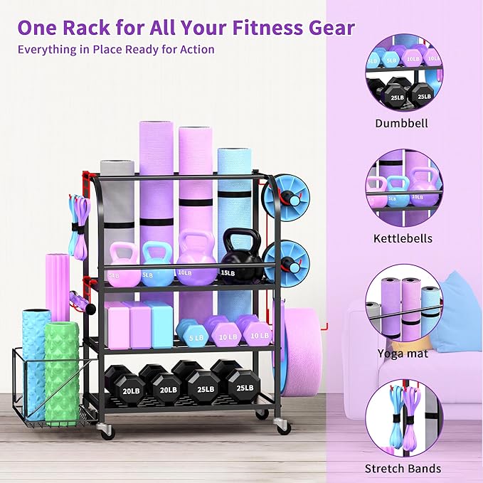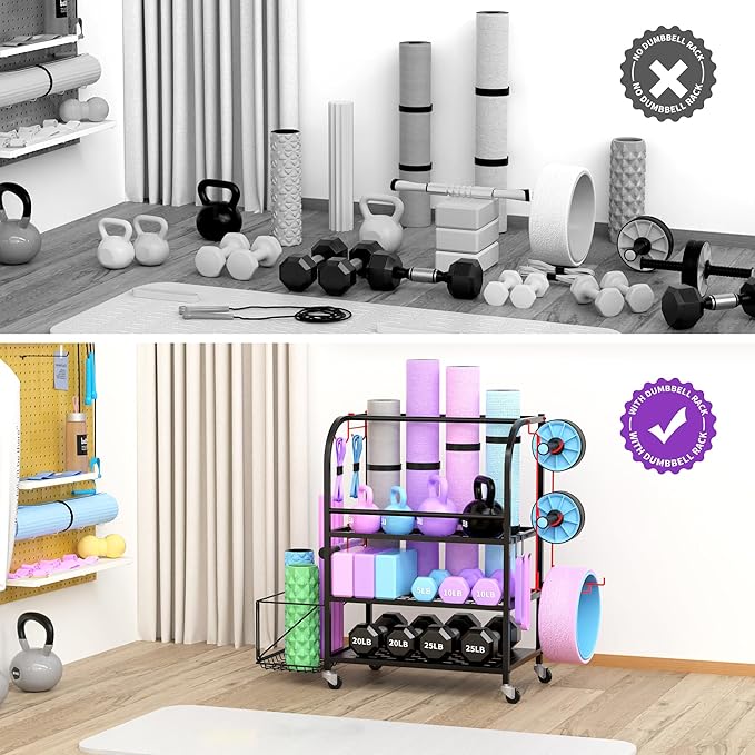 - [Versatile Storage & Ample Storage]: This weight rack is used to organize various fitness accessories, capable of holding yoga mats, foam rollers, resistance bands, and more. Dumbbell rack stand only also includes extra side hooks used for hanging jump ropes and resistance bands, maximizing space. The multi-layer design ensures all your equipment is within reach and easy to organize, solving the problem of cluttered workout spaces and keeping your home gym neat and tidy