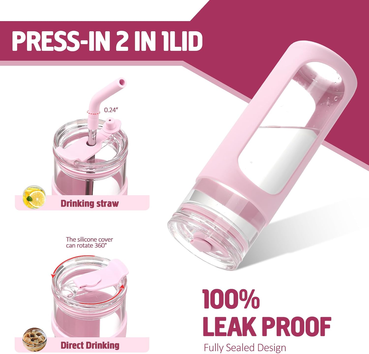 - NATURAL &SUSTAINABLE MATERIALS-Kodrine glass tumbler with lid and straw features with 2 lids-BAMBOO LID and ON-THE-GO LID, also comes with 2 reusable straws + bonus straw cleaner. Food-grade silicone sleeve & non-slip base (BPA-free),High borosilicate glass(odor/taste resistant)