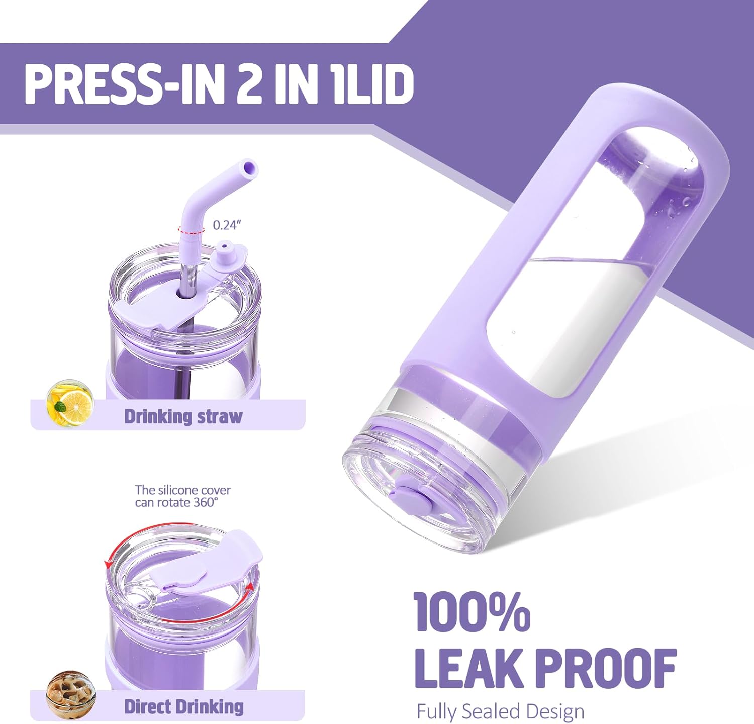 Kodrine 24oz Glass Tumbler with 2 Lids and Straws, Glass Cup With Bamboo Lid and On-the-go Lid, Reusable Iced Coffee Cup, Ideal for Smoothie, Cold Drinks, Fit Cup Holder, BPA Free (1, Purple)