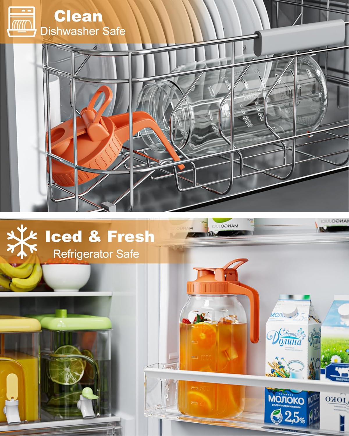 Glass Pitcher with Airtight Lid and Spout, 64oz Glass Mason Jar | Wide Mouth | Leakproof | Water Jug for Juice, Sun Iced Tea, Cold Brew Coffee, Milk Storage, Orange