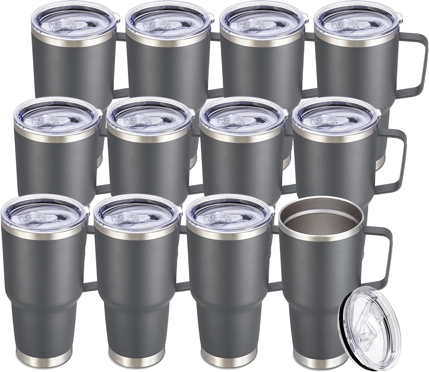 30 oz Tumbler with Handle and Lid, Stainless Steel Tumblers Bulk Double Wall Vacuum Insulated Travel Mug Leak Proof Cup Keep Drinks Cold and Hot Grey, 12 Pack