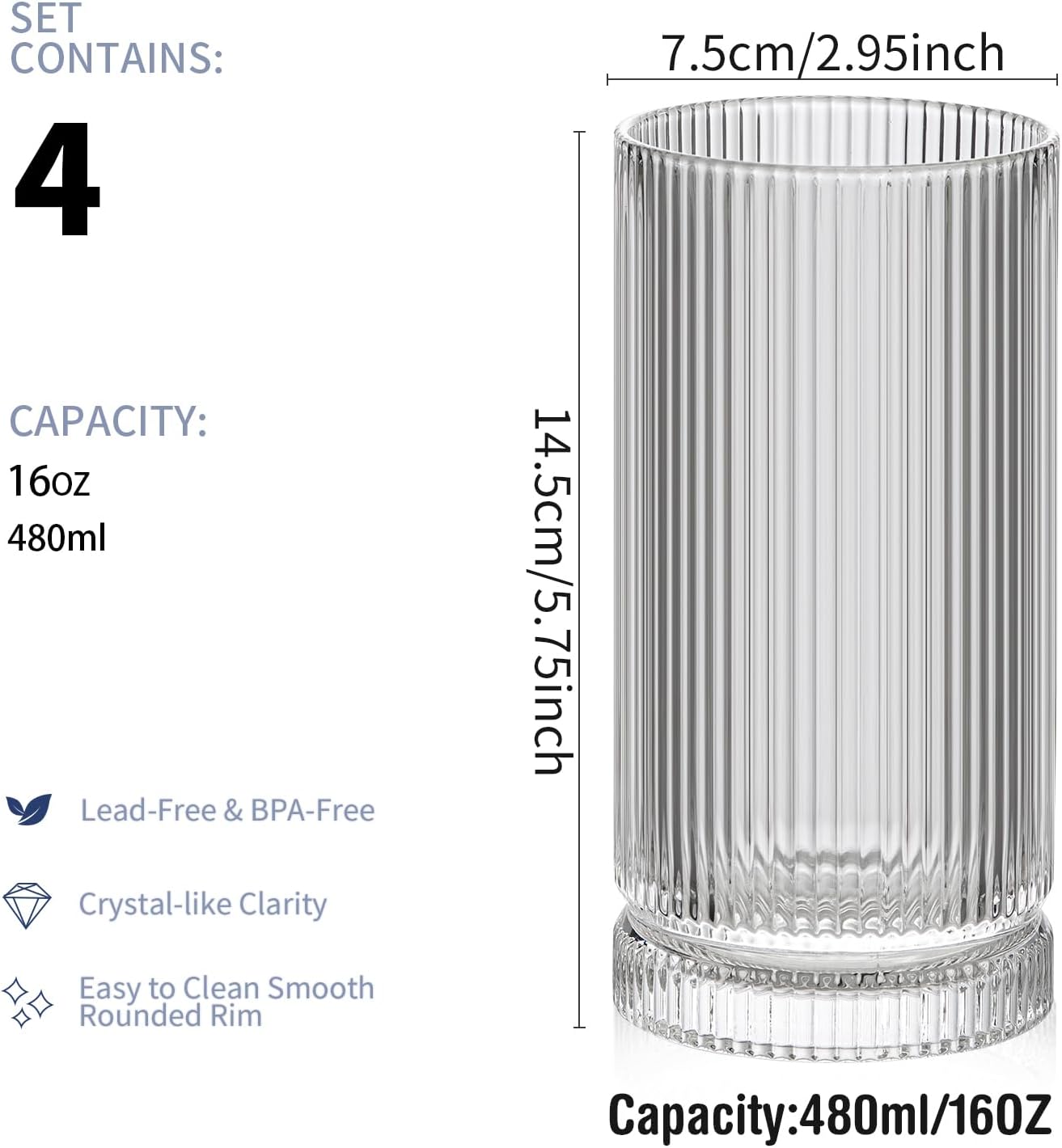 16oz Ribbed Glassware, Vintage Drinking Glasses Set of 4, Cocktail Glass Cups, Elegant Tom Collins Glasses, Highball Ribbed Glasses Ideal for Water, Iced Coffee, Juice, Beer, Milk