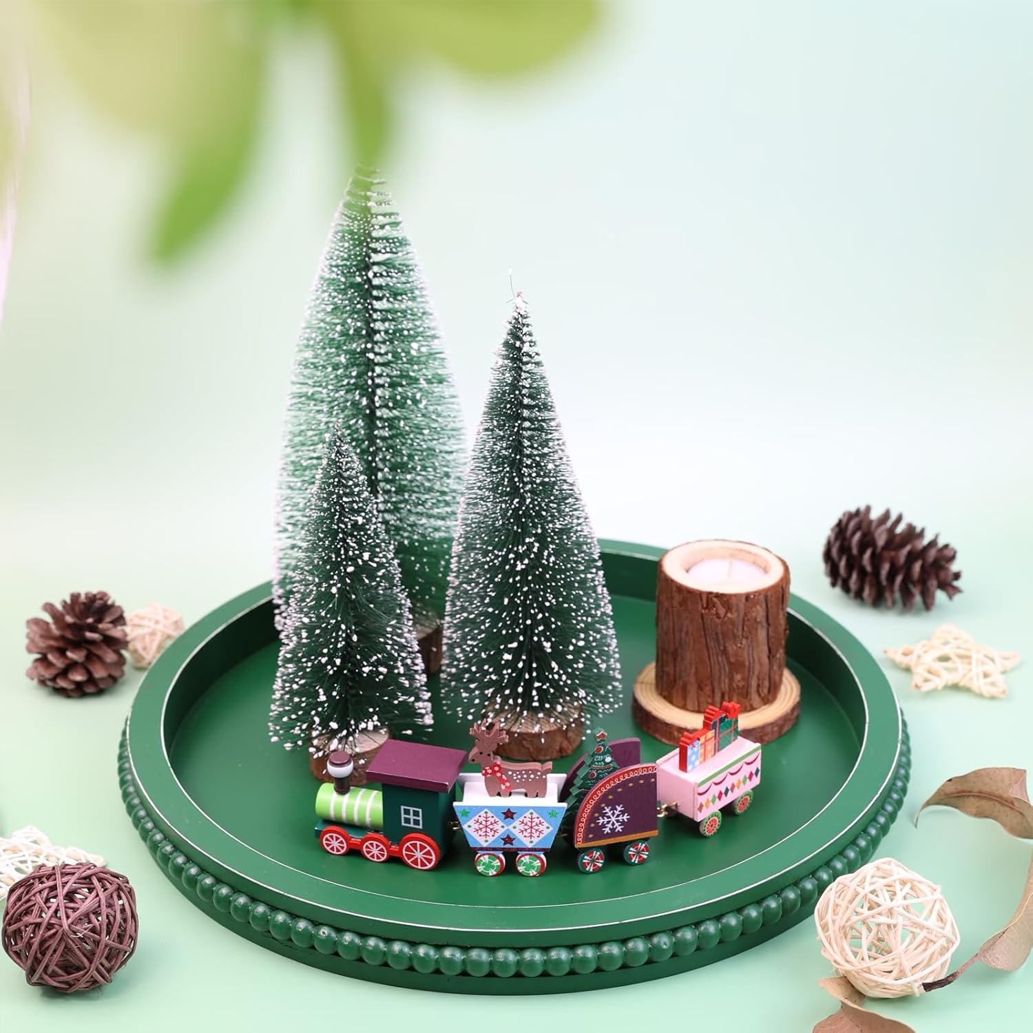 Green Round Wood Decorative Ottoman Tray for Coffee Table Kitchen Counter, Living Room, Handcrafted Green Wooden Serving Tray for Table Centerpiece