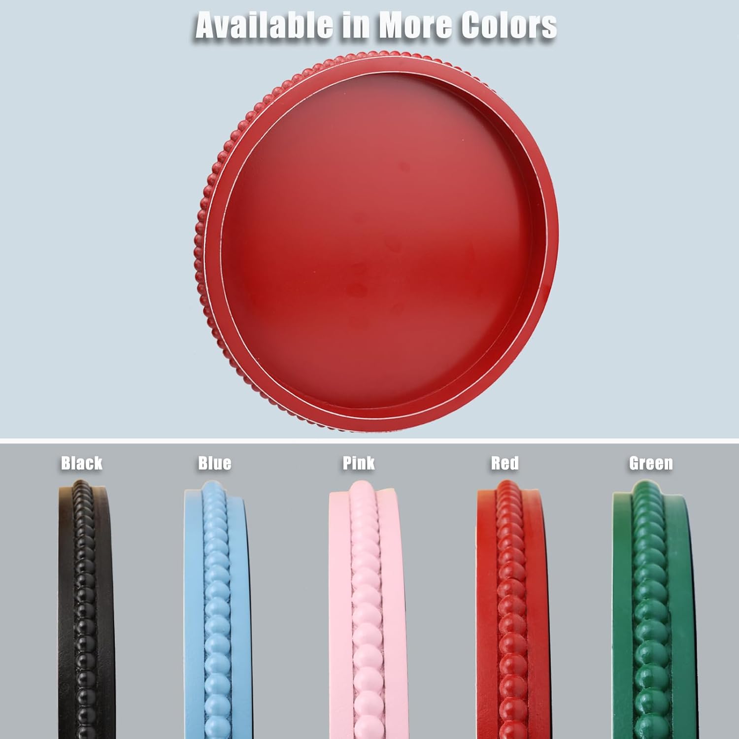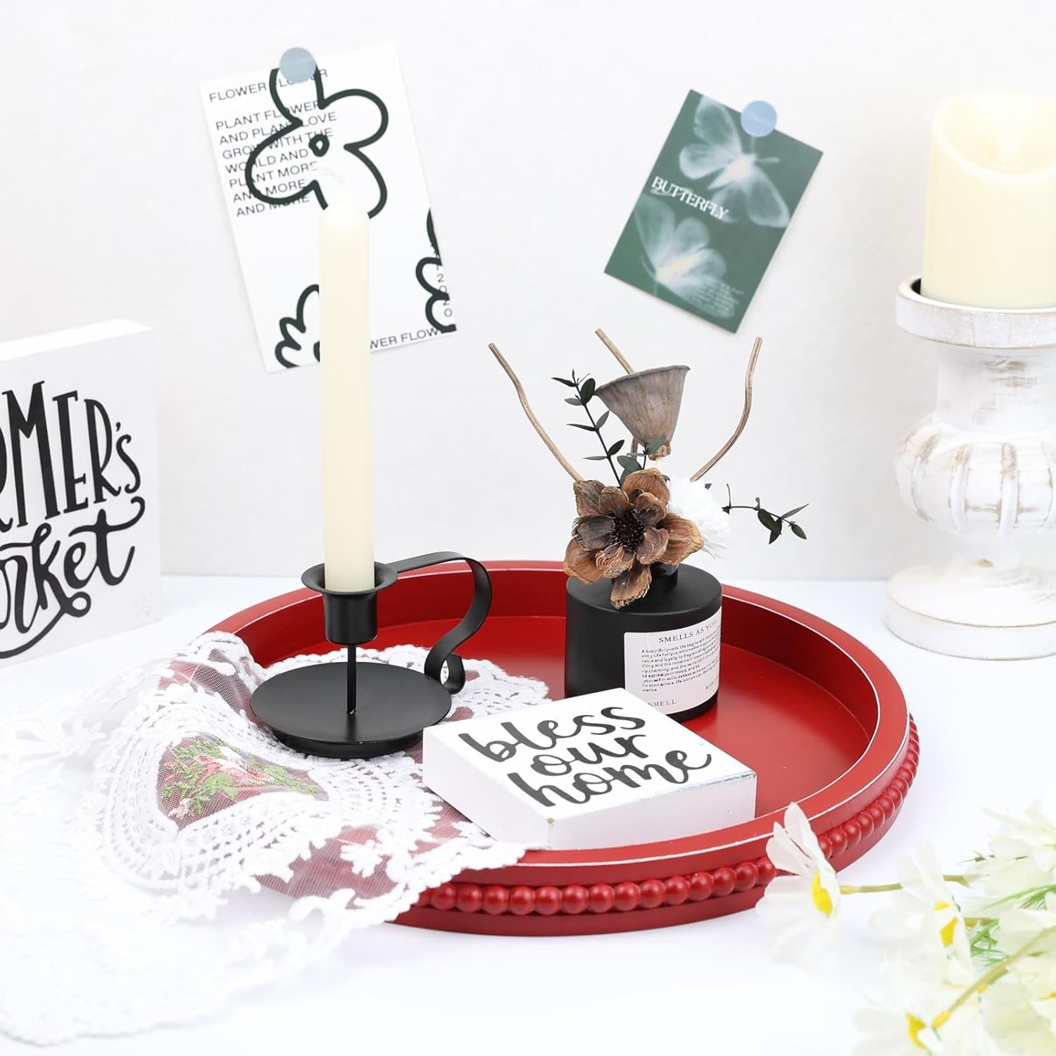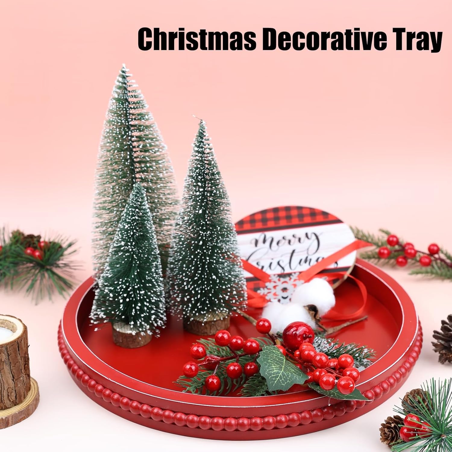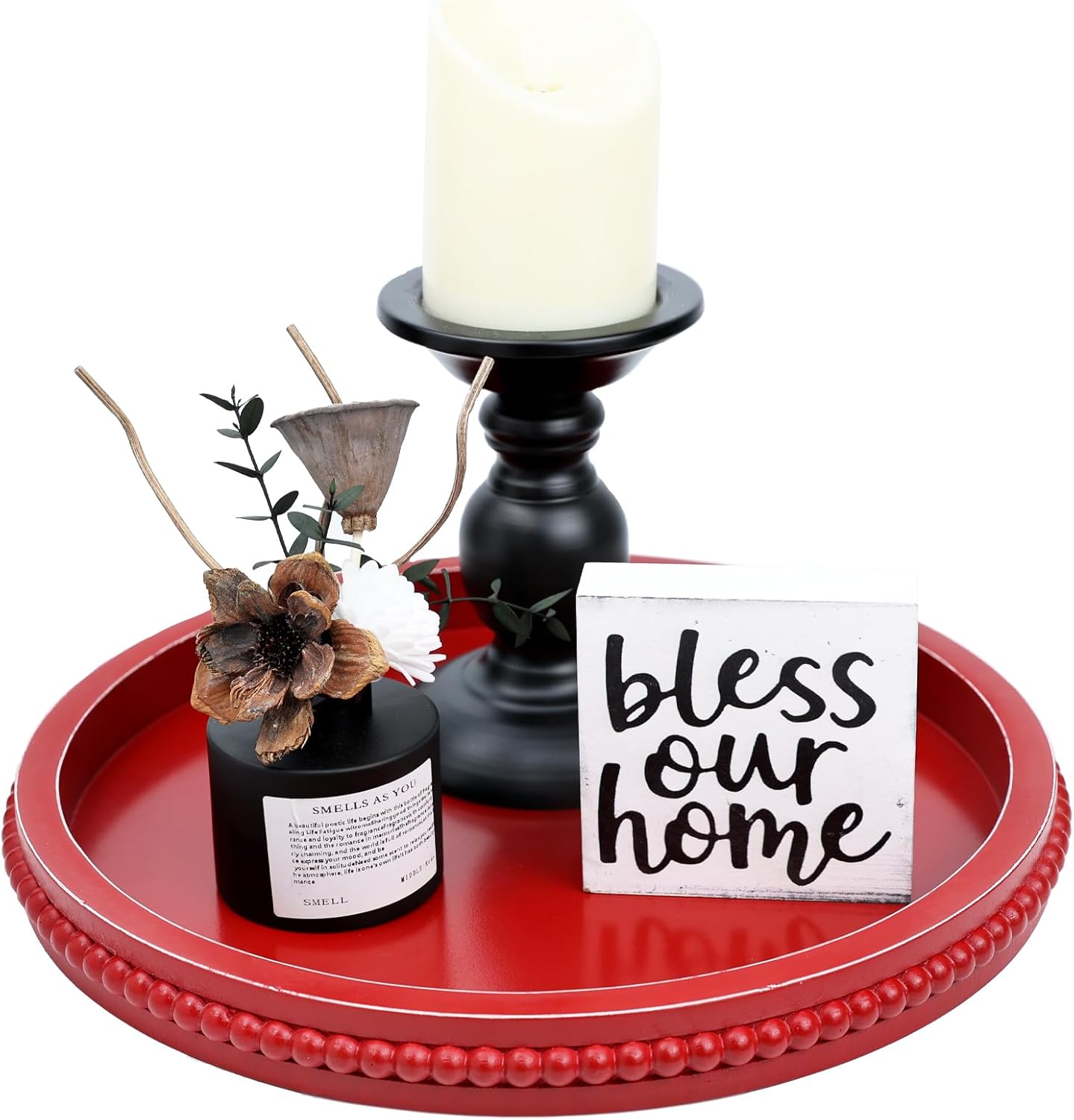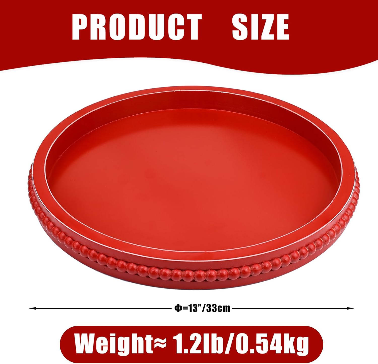Red Round Wood Decorative Ottoman Tray for Coffee Table Kitchen Counter, Living Room, Handcrafted Wooden Serving Tray for Table Centerpiece