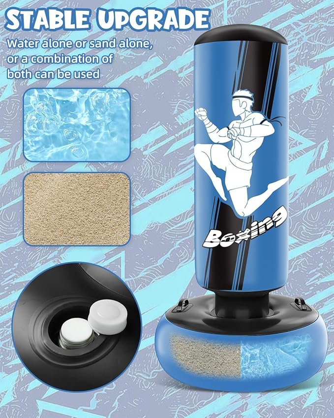 - Easy Assembly: Simple to assemble and maintain, fill the base with sand or water for stability against powerful punches and kicks. Inflate the upper part, close the air valve, and it's ready for use.