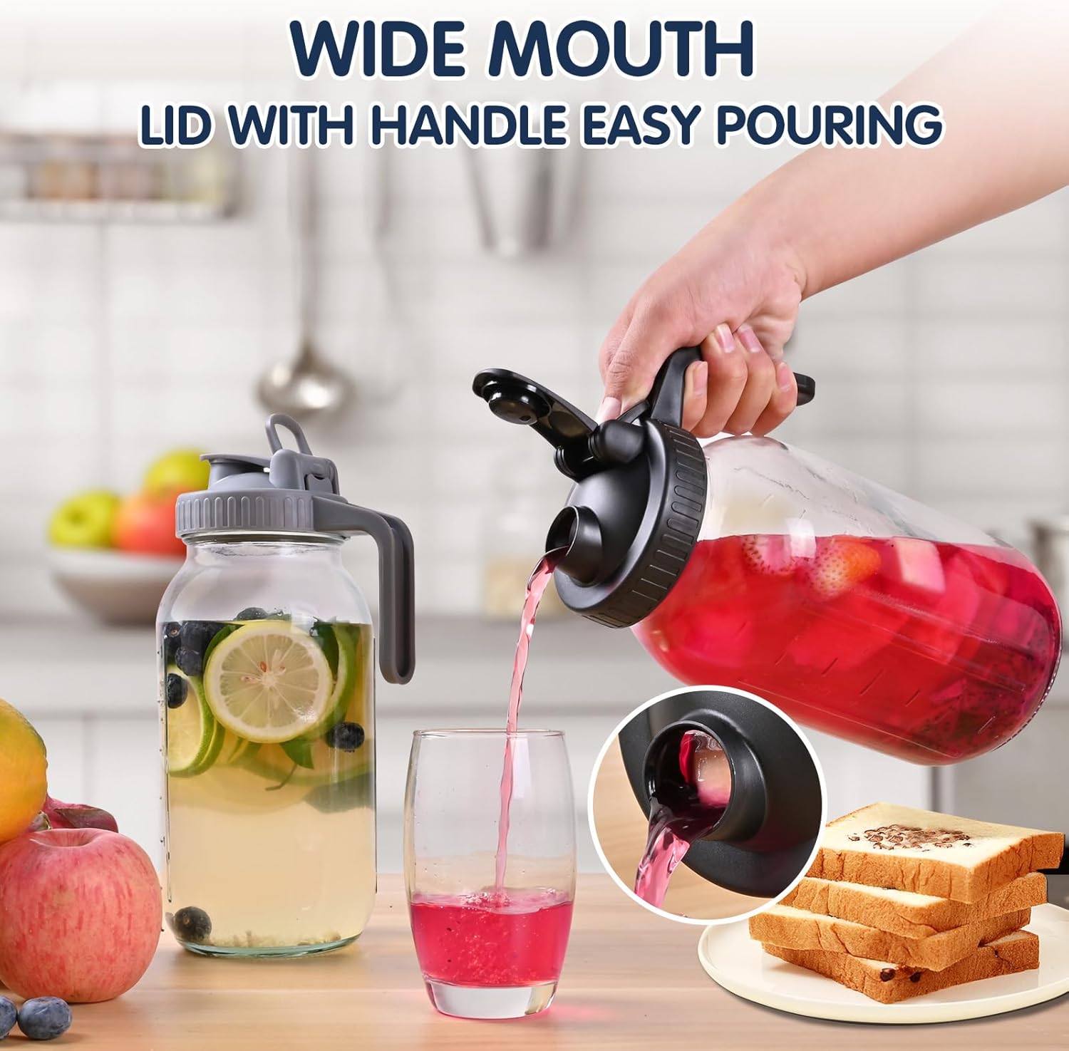3 Packs 64OZ Glass Pitcher with Lid, Wide Mouth Mason Jar Water Jug, Leak-Proof Airtight Mason Jar for Cold Brew Coffee, Iced tea, Milk, Food Storage, Sun Tea