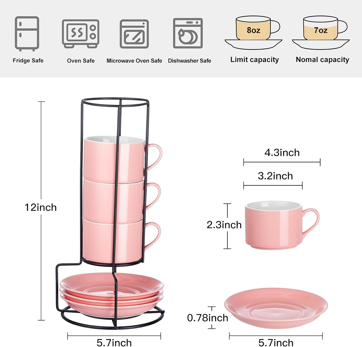 8oz Porcelain Stackable Cappuccino Cups with Saucers and Metal Stand Set of 4, Coffee Cups for Espresso, Specialty Coffee Drinks, Latte, Americano and Tea - Pink