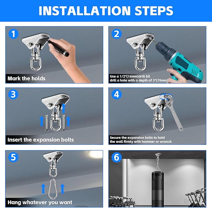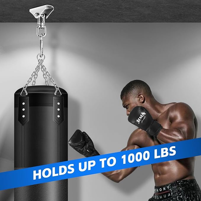 - Safety And Stability: Punching bag hanger is made of high quality 304 stainless steel and can hold up to 1000 lbs. Punching bag holder kit is high hardness, robustness, and corrosion resistance. Can take the force from the hits and kicks on the bag and securely mounted to the ceiling
