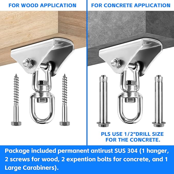 - Universal Design: Our punching bag mount suitable for concrete ceilings and wooden beams, can be used indoors and outdoors. Heavy bag hanger is not just for punching bag, it can also be used as swings, porch swings, sling swings, yoga swings, hammock, or any other swing used for playground swings