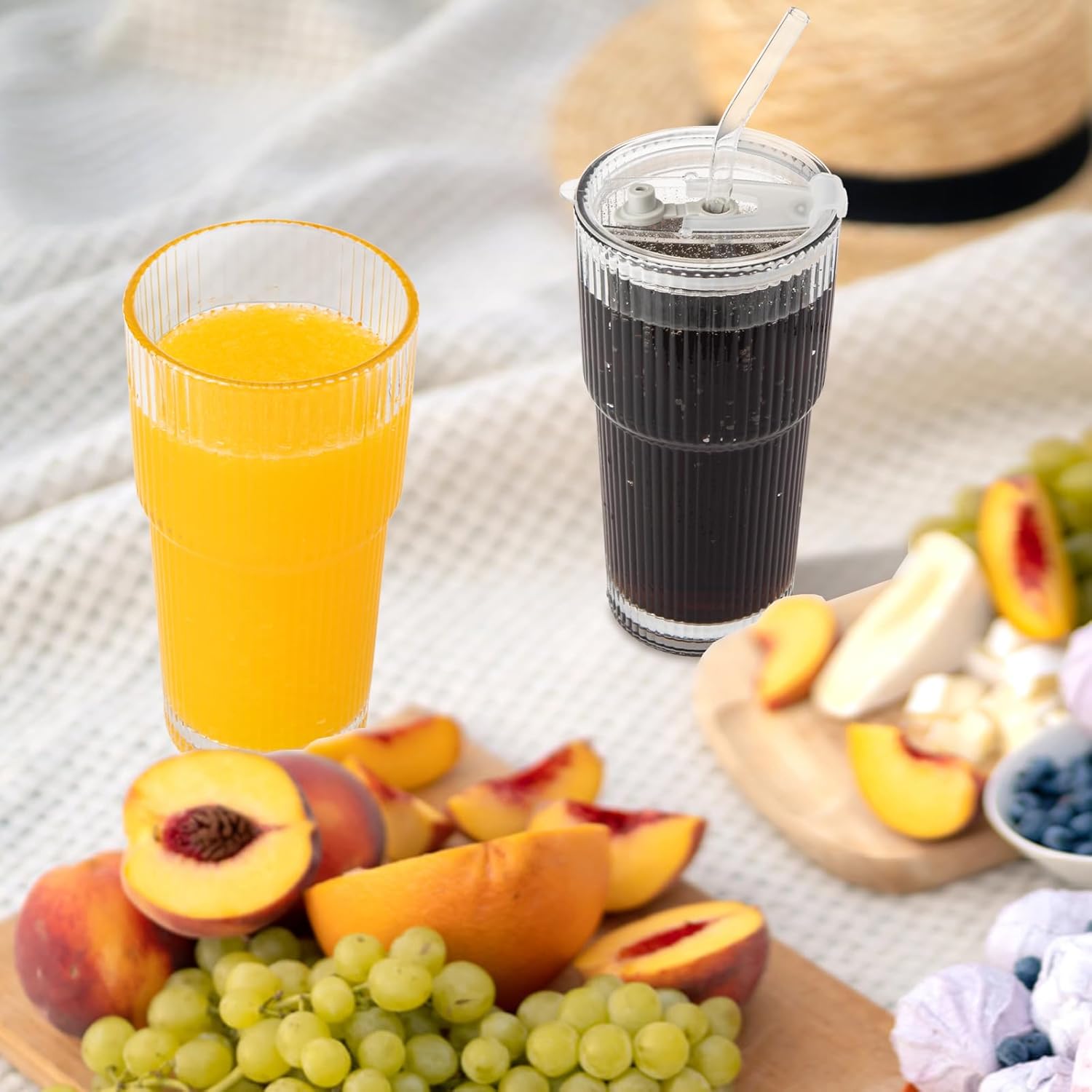 20oz Ribbed Glass Cups with Lids and Straws 4 Set, Vintage Glassware for Whiskey Cocktail Beer, Glass Tumbler, Iced Coffee Cups For Cold Drinks, Smoothie, Juice,Drinking (4)
