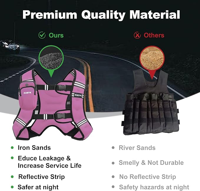 - Adjustable Straps & Reflective Stripes: Each weighted vest has adjustable straps to prevent slipping or sliding, ensuring a better fit for users of all chest sizes and improving exercise efficiency. The reflective strips on both sides of the weighted vest reflect vehicle headlights for safer night running, keeping you away from traffic accidents in any weather conditions (rain, fog, darkness), day or night