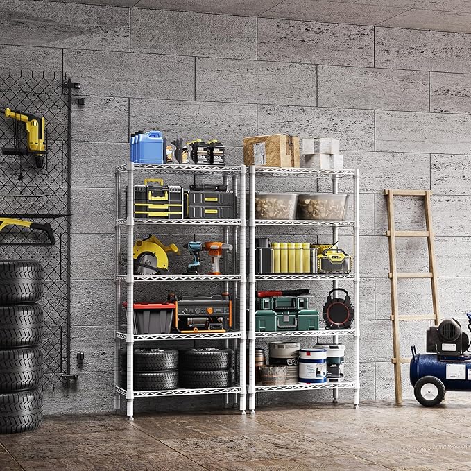 - VERSATILE DESIGN: The shelving units offer incredible versatility. It is suitable for use in a garage, balcony, pantry, and kitchen. Its special coating ensures water resistance, making it accommodated for humid environments like bathrooms