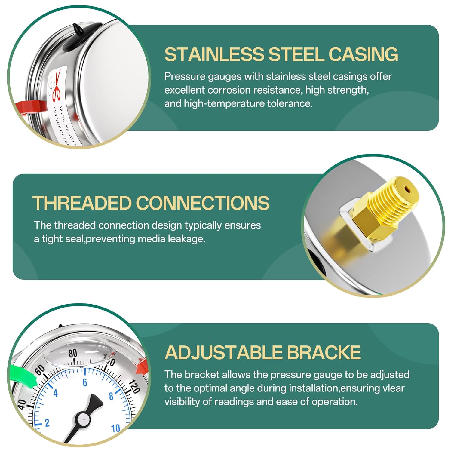 - [MATERIAL FEATURES] 304 stainless steel housing, corrosion-resistant, glycerin filled for stable readings and to avoid vibration damage.