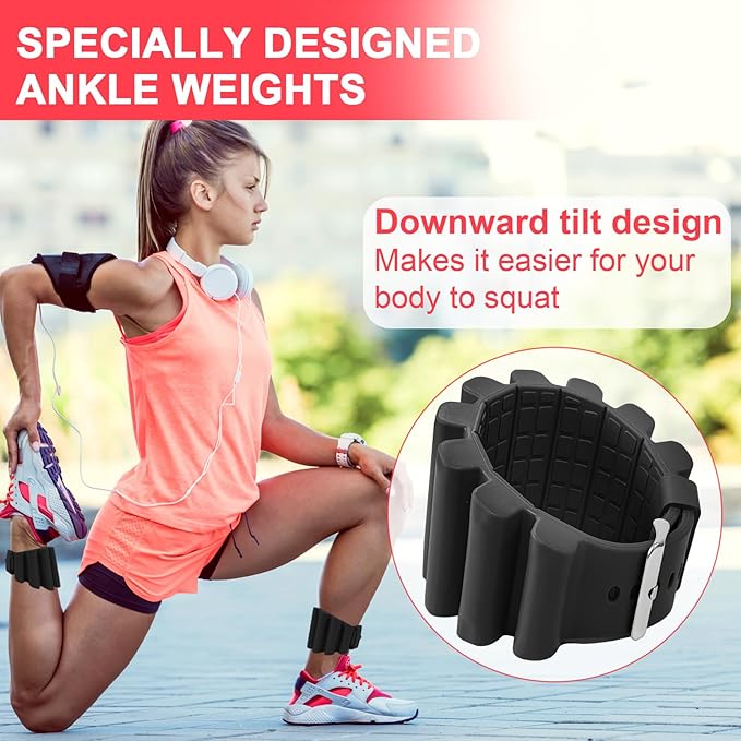 - [2LBS WRIST WEIGHTS SET of 2] The weight of each wrist weighted bracelet is 1 pound. The wrist weights are easily adjustable, with different buckle holes to accommodate your wrist/ankle or arm/leg size. The downward tilt design makes it easier for your body to squat. Whether you're looking to enhance strength training or improve aerobic performance, our adjustable wrist and ankle weights add comfortable resistance, making the weighted wristbands an essential kit for fitness workouts that can be used anytime, anywhere.