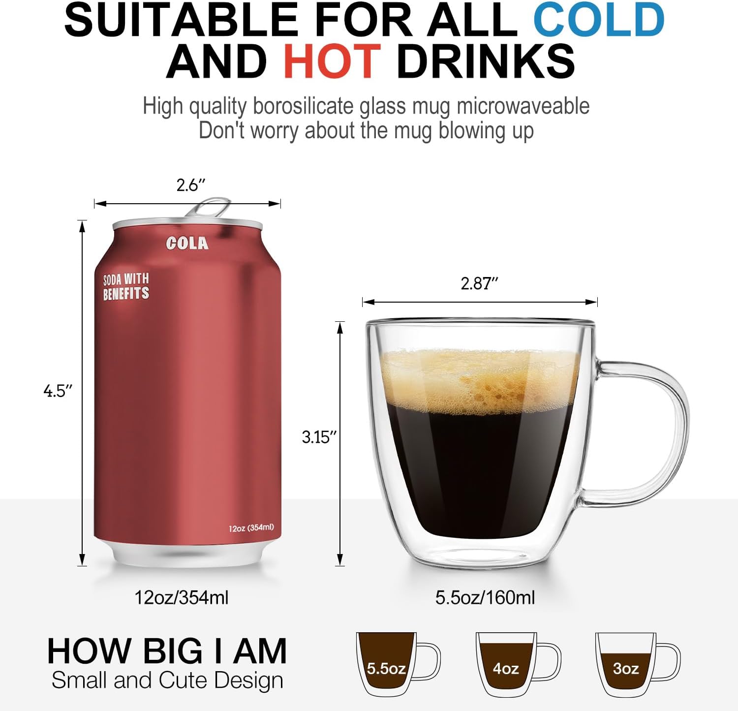 Espresso Cups Set of 4, Double Wall Hand Blown 5.5OZ Espresso Shots Glass, Coffee Mugs with Handle Perfect for Cappuccino, Latte, Tea