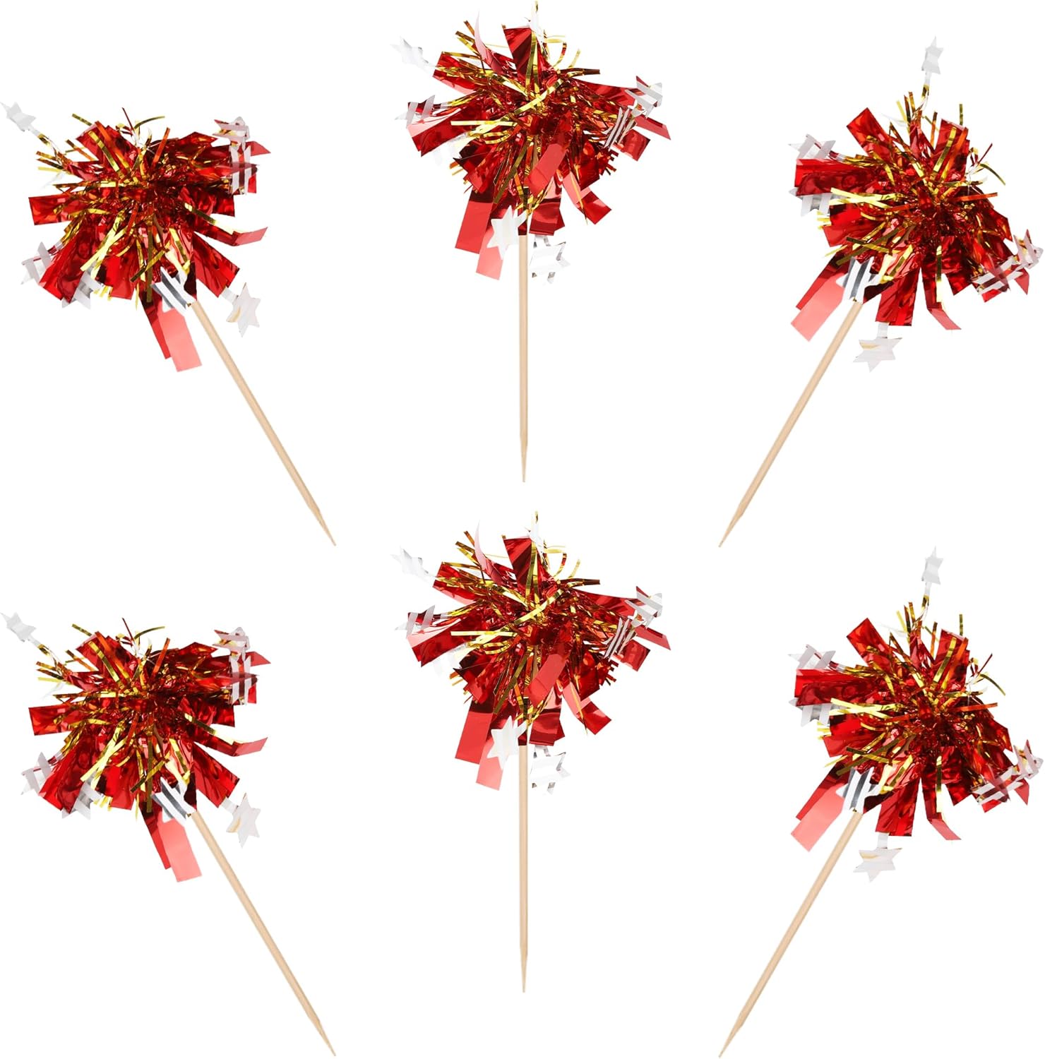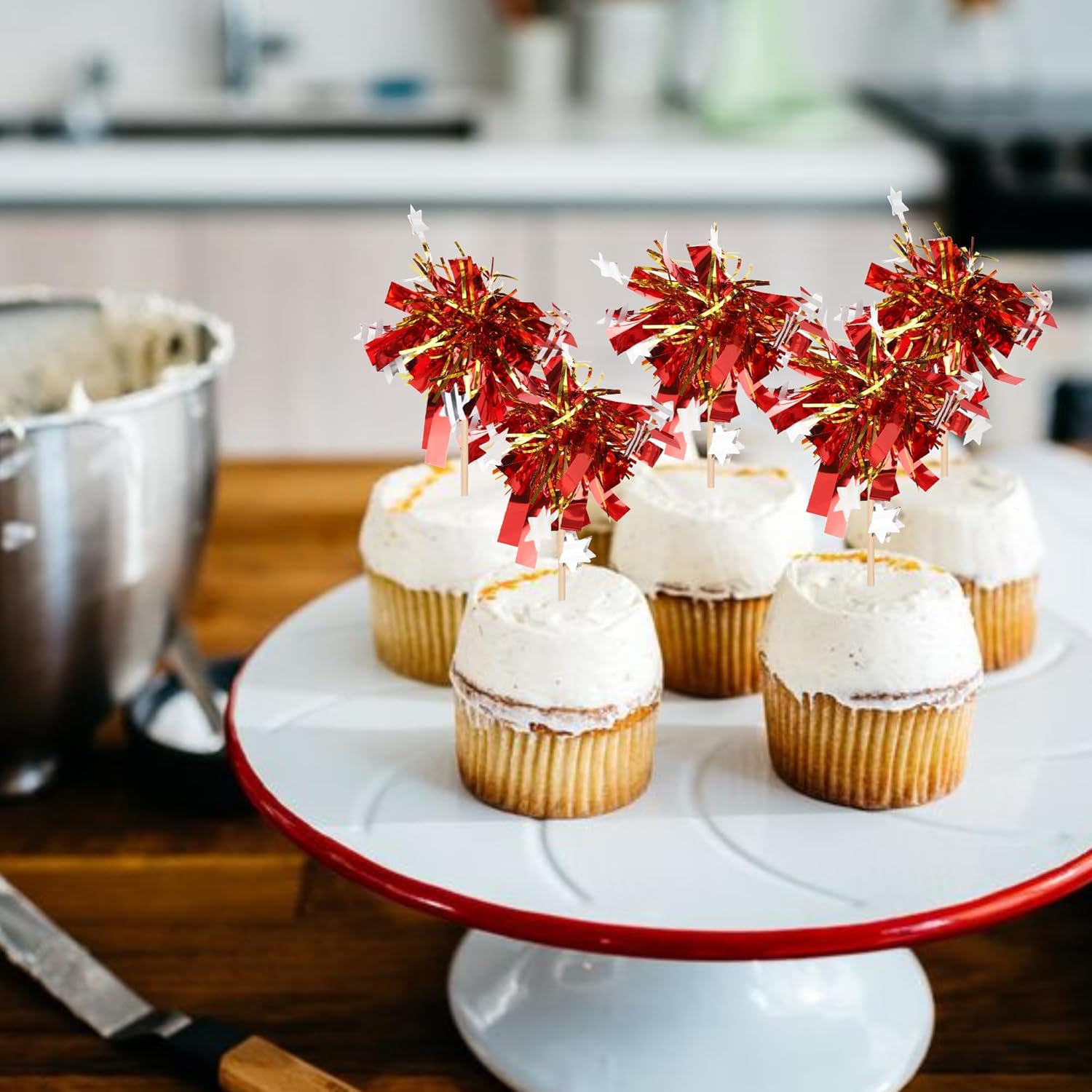 30 PCS Foil Firework Cupcake Toppers Happy Birthday Star Cupcake Picks Sparkle Tinsel Drink Stirrers Cocktail Fruit Toothpicks for Valentine's Day Wedding Birthday Party Decorations Supplies Red Gold