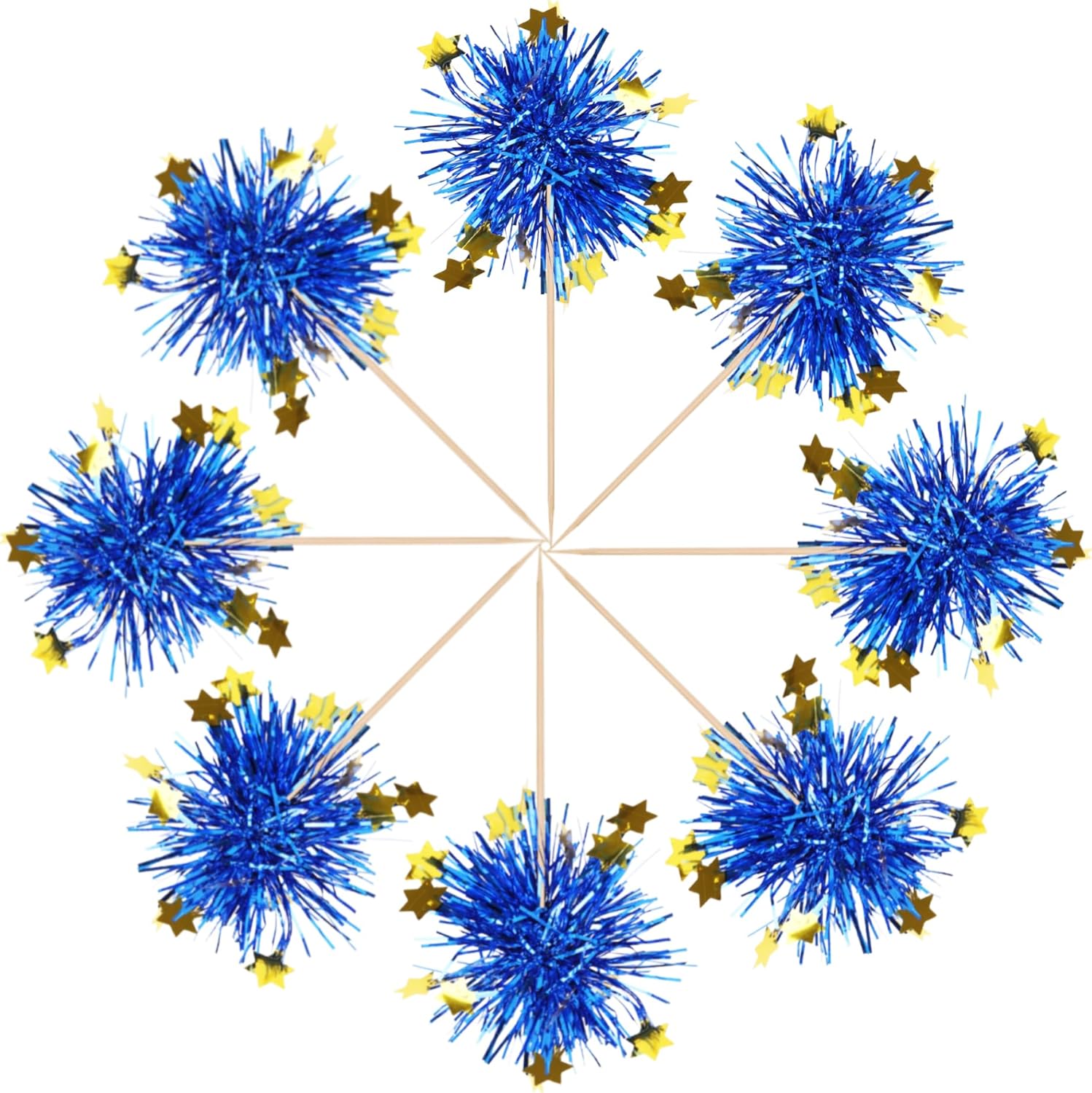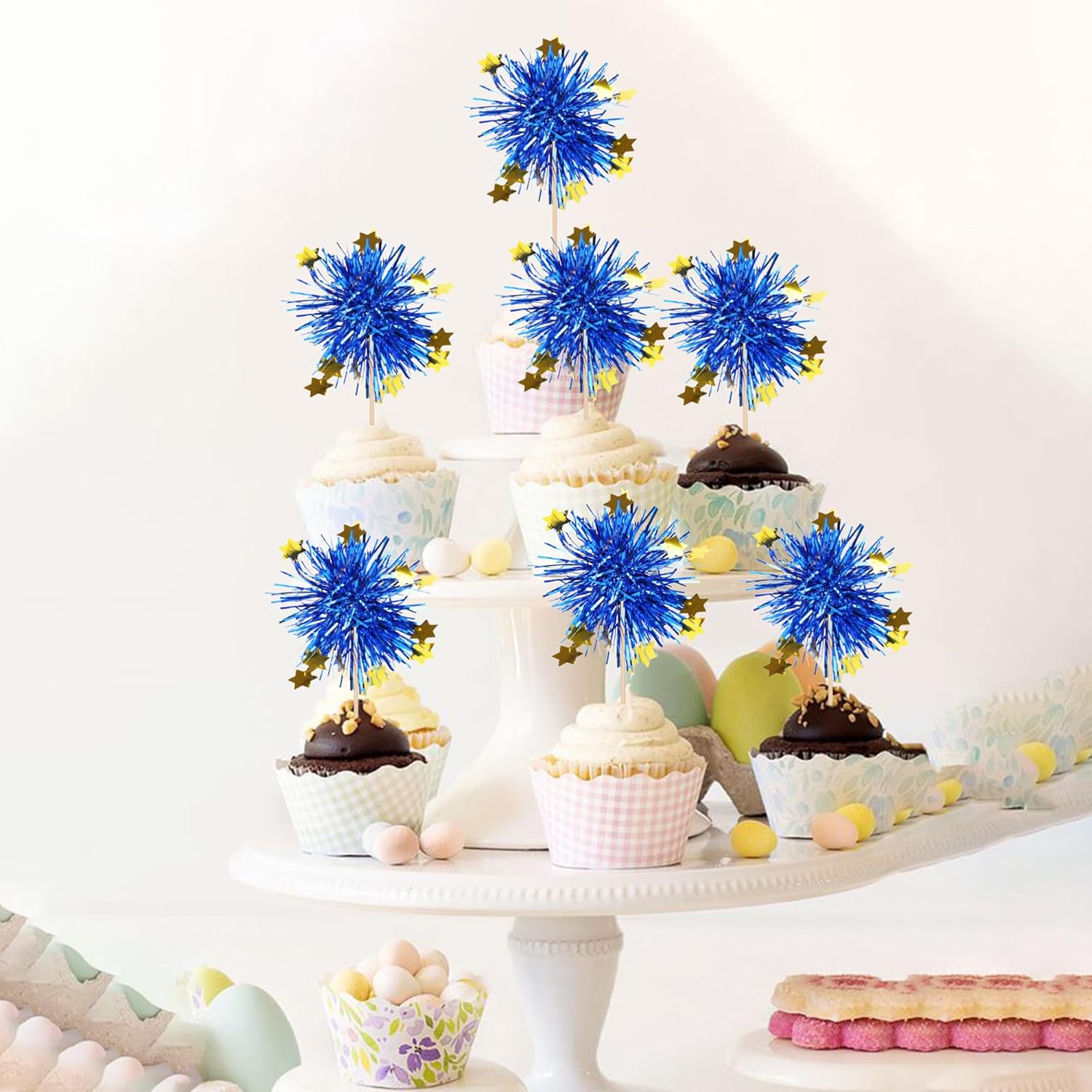 30 PCS Foil Firework Cupcake Toppers Happy Birthday Star Cupcake Picks Sparkle Tinsel Drink Stirrers Cocktail Fruit Toothpicks for Valentine's Day Wedding Birthday Party Decorations Supplies Blue
