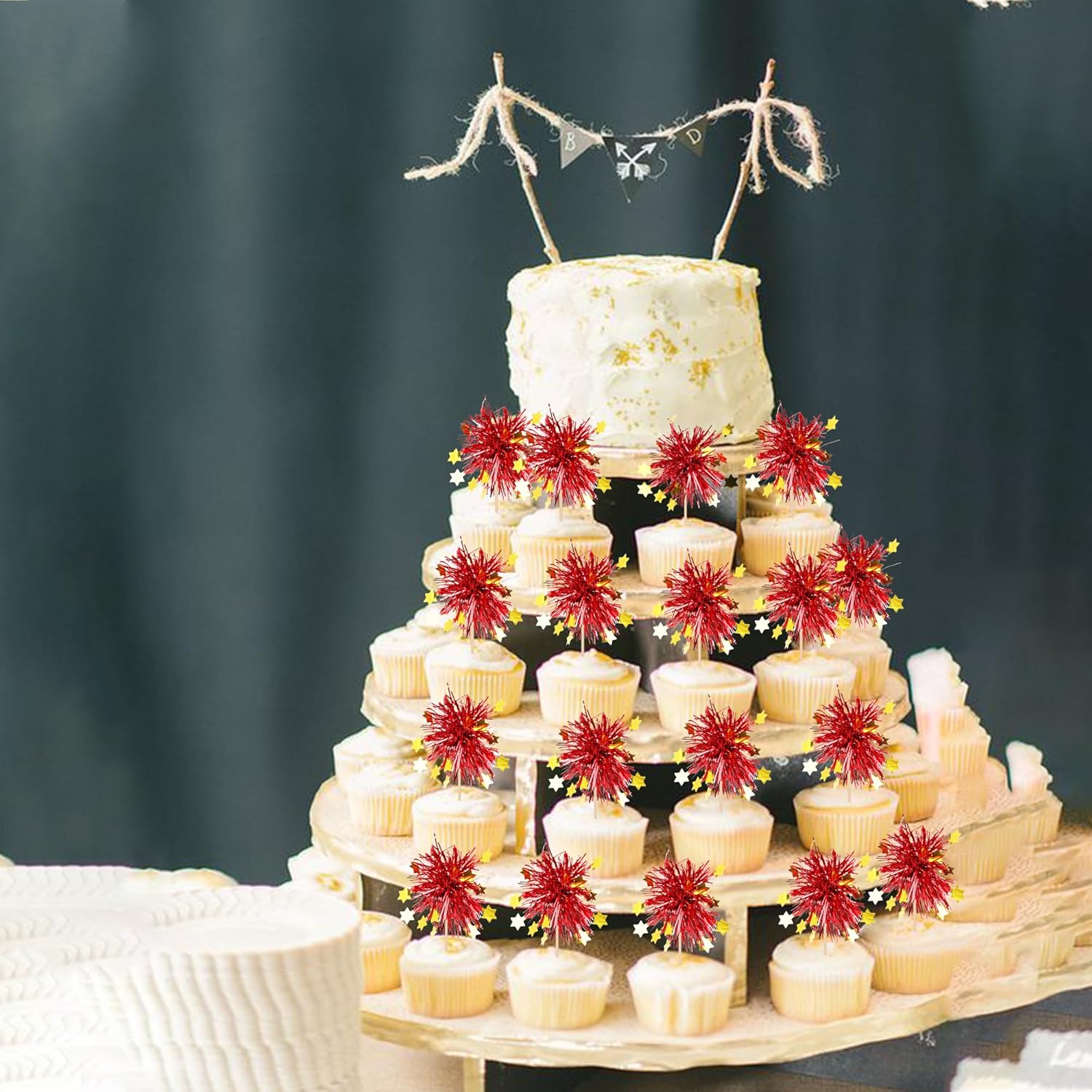 30 PCS Foil Firework Cupcake Toppers Happy Birthday Star Cupcake Picks Sparkle Tinsel Drink Stirrers Cocktail Fruit Toothpicks for Valentine's Day Wedding Birthday Party Decorations Supplies Red