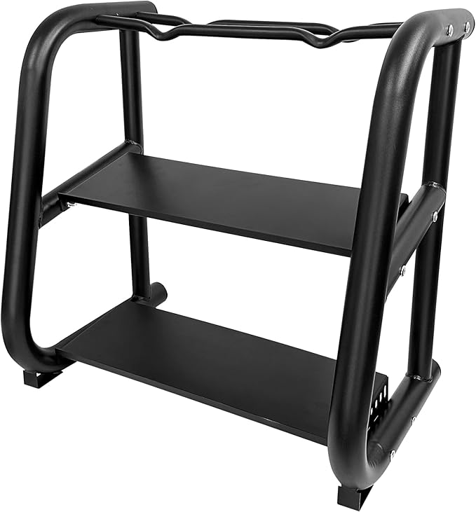 - Dual Shelves: Features two spacious shelves to neatly store and organize multiple kettlebells of various weights and sizes