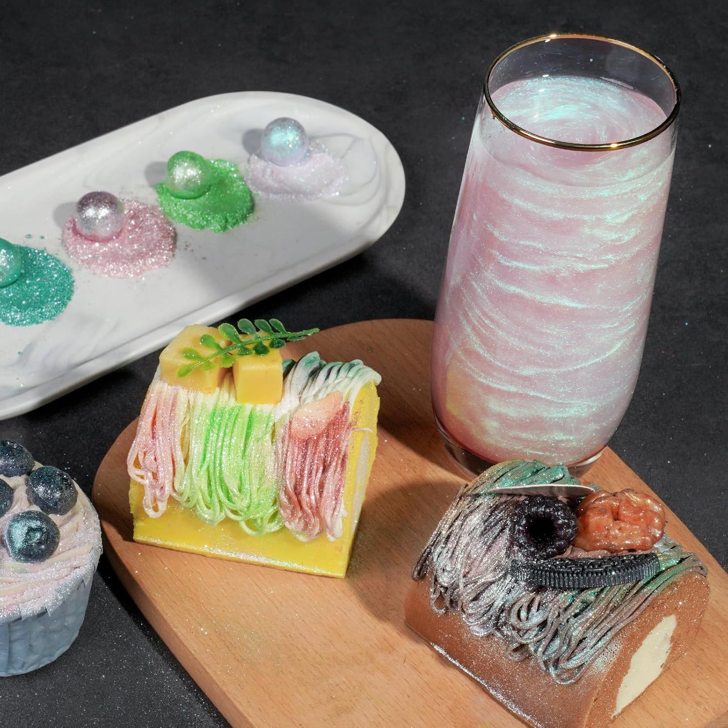 - 🌟【Easy to Use】Specially developed for food decoration and craft industries, this luster dust produces realistic looks by highly pigmented colors with a metallic finish. The pretty fine grain is more convenient for painting. To add glimmer and sparkle to your creations, simply sprinkle or dry brush the luster glitters on them. This product adheres very well to both wet and dry mediums. Attention: Seal and store glitter powder in a cool and dry place after use. Do not expose to excessive heat.
