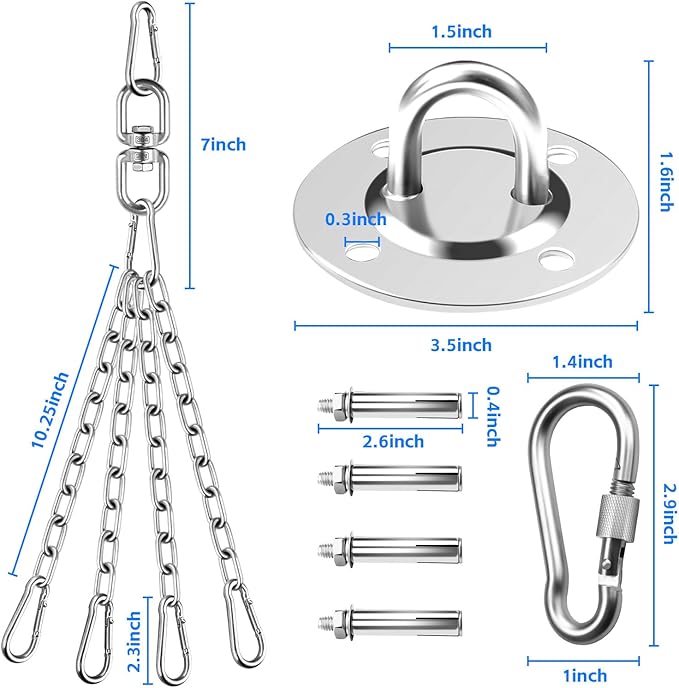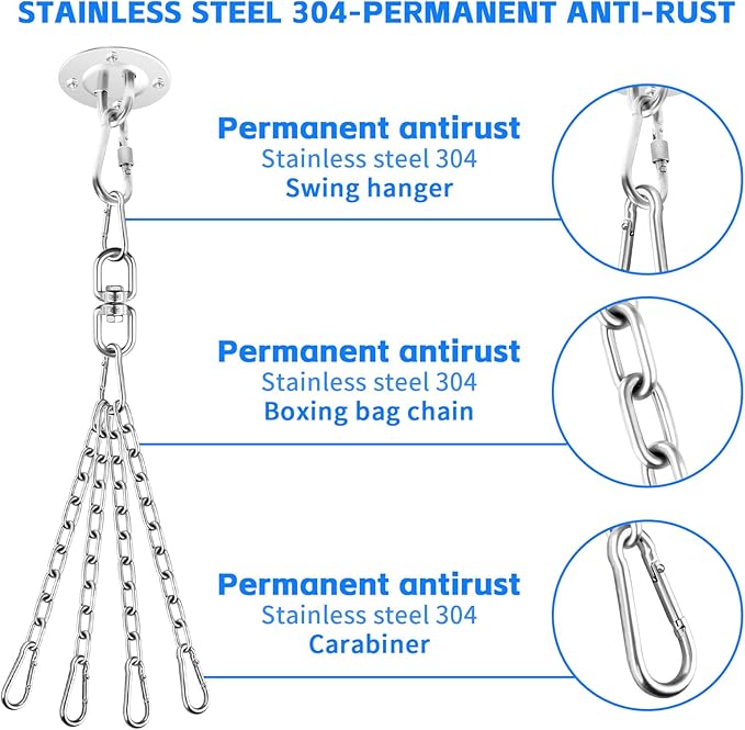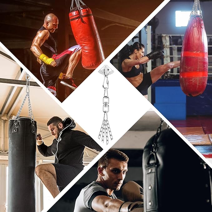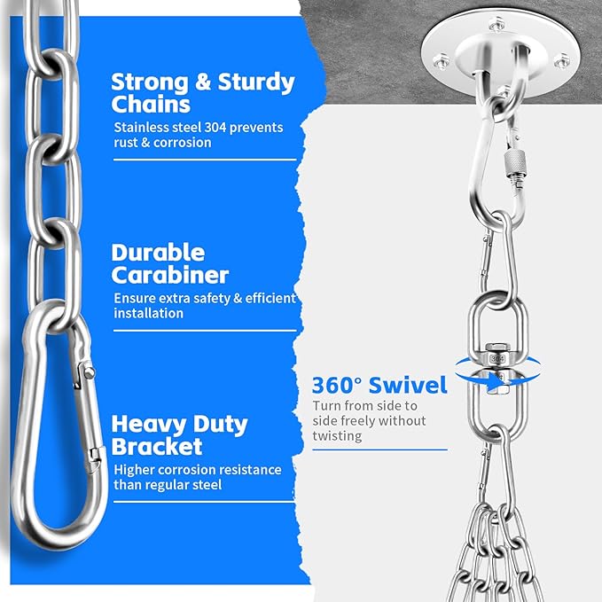 - Safety and Stability: 4 strong spring hooks on each end of the hanging chain help provide a safe and secure connection that won't tangle, ensuring that the hanger stays in place throughout the workout and allows the pubching boxing bag chains to rotate smoothly and quietly