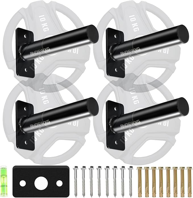 - Weight Plate Storage Rack for Home Gym - Wall-Mounted Bumper Plate Holder with Heavy Duty Steel · High Capacity Storage: Designed to hold multiple weight plates securely, perfect for organizing your home gym. · Tilted Plate Holder: Slight 2° tilt prevents plates from sliding off, keeping them safely stored. · Durable & Scratch-Resistant: High-quality steel with a protective hard-coat finish. · Universal Fit: Fits all 2" Olympic weight plates, with included installation hardware for both wood and concrete walls. · Impact Protection: Foam padding reduces wear and tear on plates and the rack.