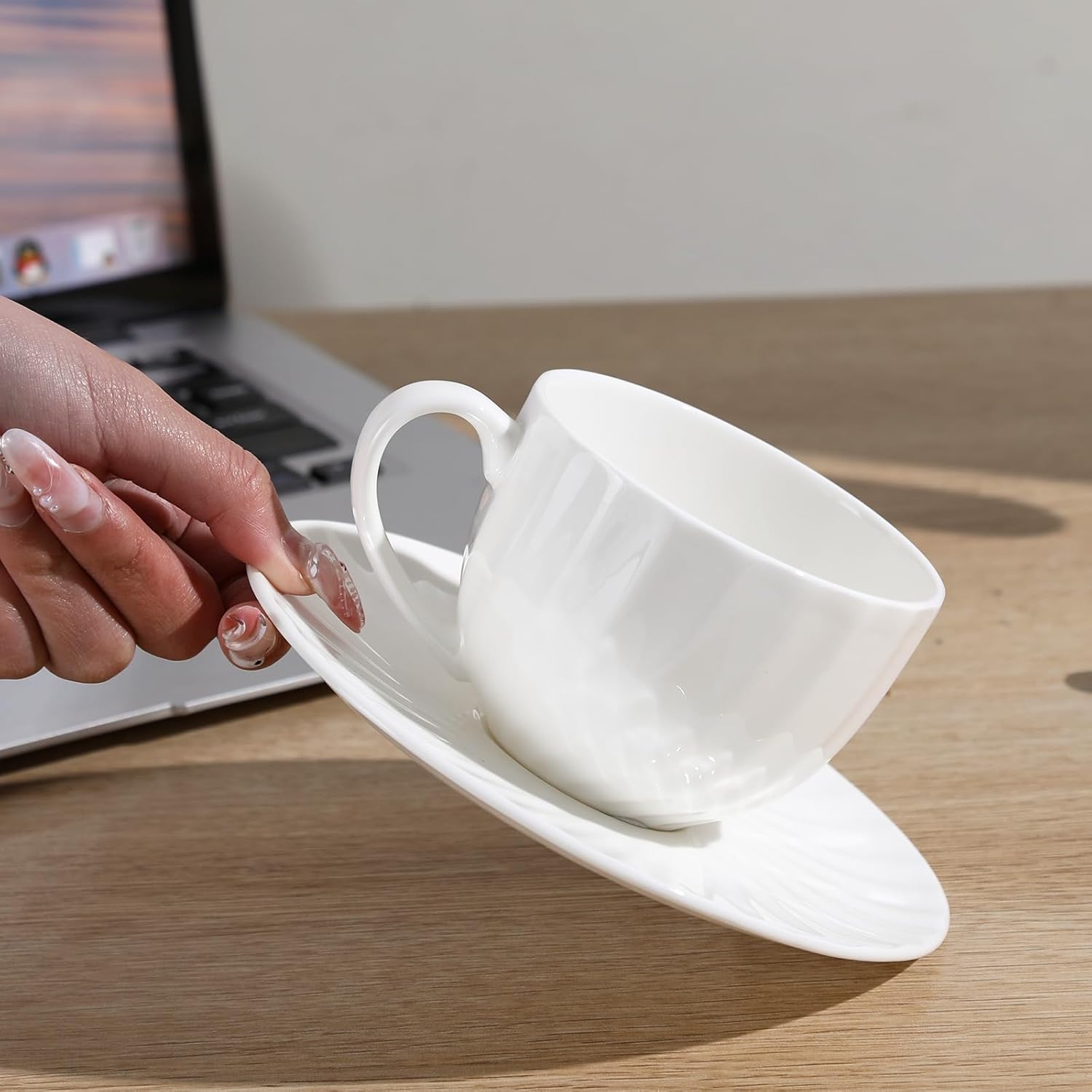 - [Anti-Slip Design] Comes with a matching saucer to ensure the cup and saucer fit perfectly, providing stability and preventing accidental slips or spills, perfect for dining table, weddings, cafes, afternoon or tea.The smooth interior and wide rim make it ideal for creating coffee art, allowing you to craft stunning designs effortlessly