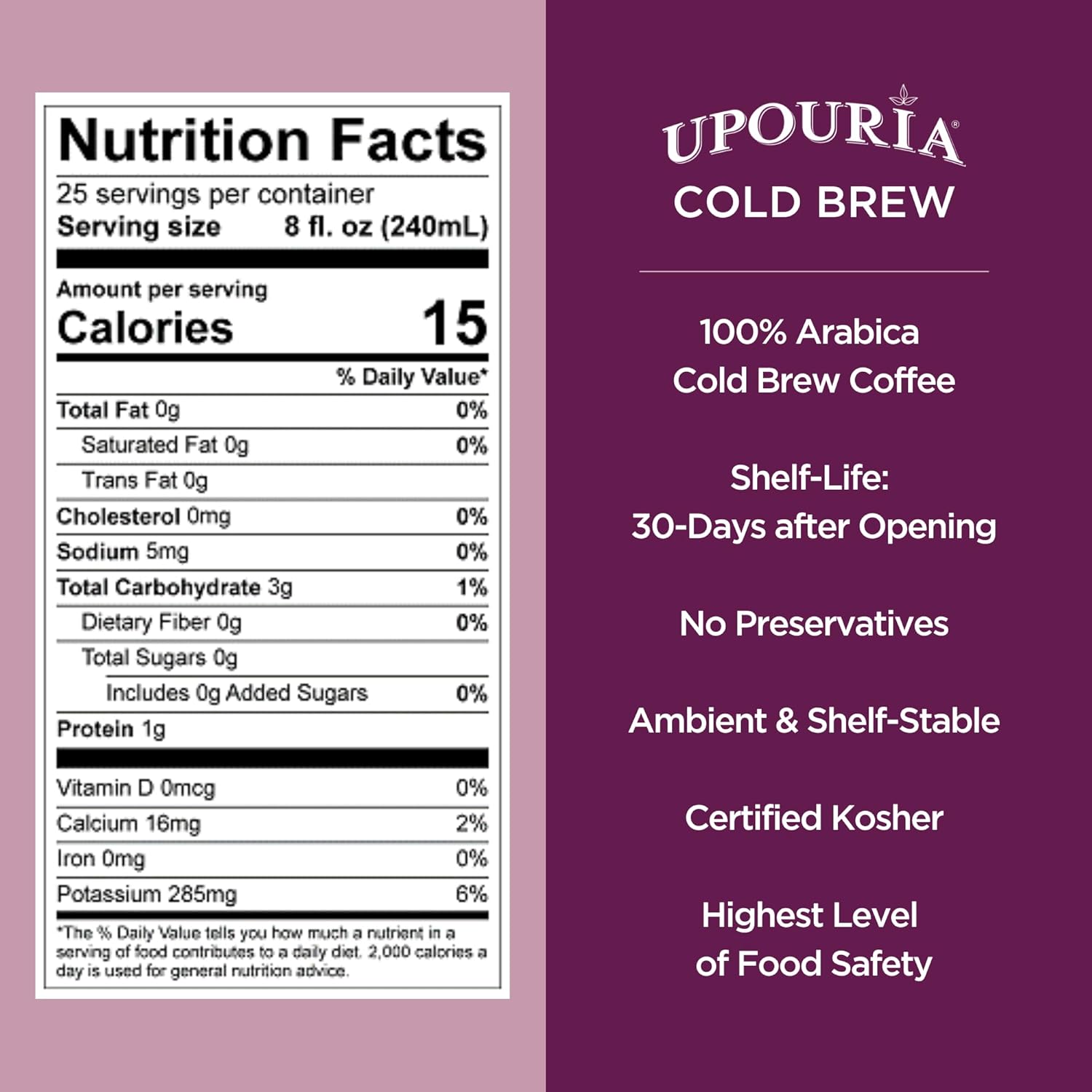 - Premium Quality: Made with 100% Arabica coffee and no preservatives, Upouria cold brew coffee pure taste in every sip. The aseptic packaging ensures long-lasting freshness, making it shelf-stable and ready to enjoy whenever you need a boost. No added sugar, just pure iced coffee & cold-brew goodness.