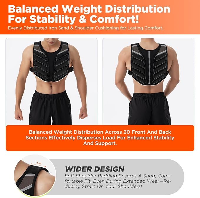 - ✅【 Balanced Weight Distribution】The Body Factor's weighted vest features 20 evenly distributed weight pockets, ensuring optimal load balance across your body. This design enhances stability, allowing for more effective training while reducing strain. It's ideal for activities such as running, strength training, and gym workouts.