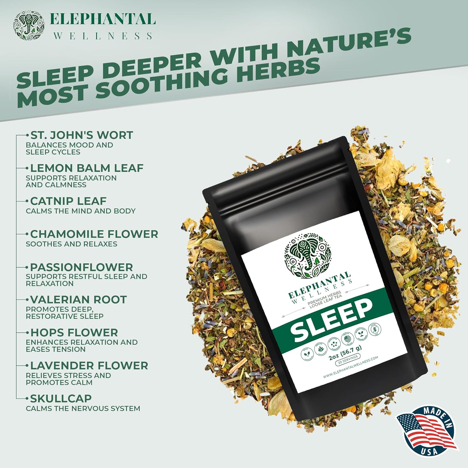 Elephantal Wellness Premium Sleep Herbal Tea | Deep Rest & Relaxation Support with Valerian Root, Passionflower, Chamomile, Lemon Balm Tea & Skullcap | Handmade, Caffeine-Free, Non-GMO Loose Leaf Blend, 2oz, 20 Servings
