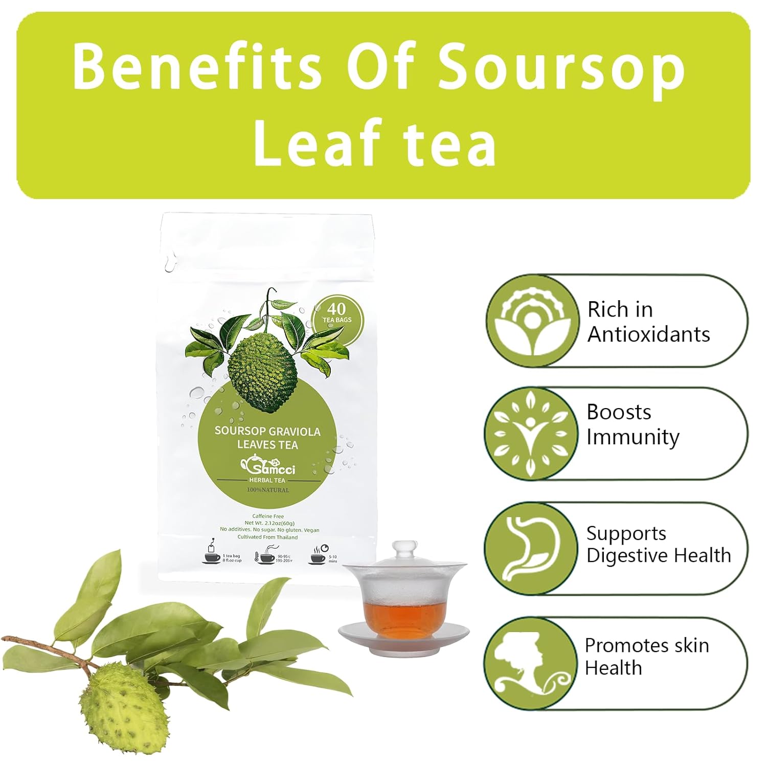 Samcci - Soursop Leaves Tea Bags, 40Teabags, 1.5g/bag, 100% Pure Sour Sop Graviola leaves Tea - Hojas De Guanabana Tea - Improve Digestion - Promotes Skin Health - Non-GMO - Caffeine-Free
