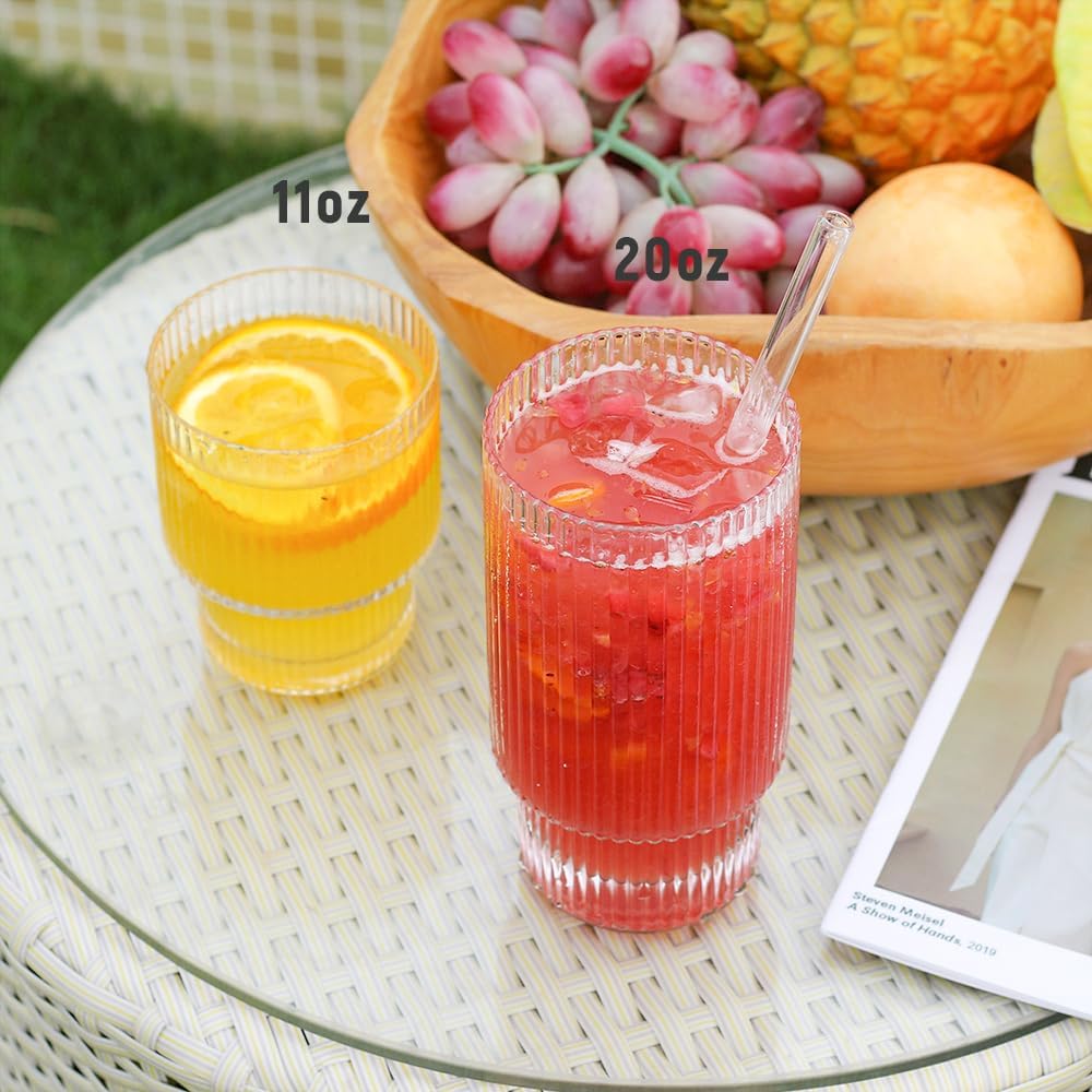 - Stackable Design - This ribbed glass cups features a wide top and narrow bottom that can be easy to be stacked . Each glass can be stacked on top of another glass which is practical and space saving. The glass on all four tumblers is made to be thin, elegant, and strong.