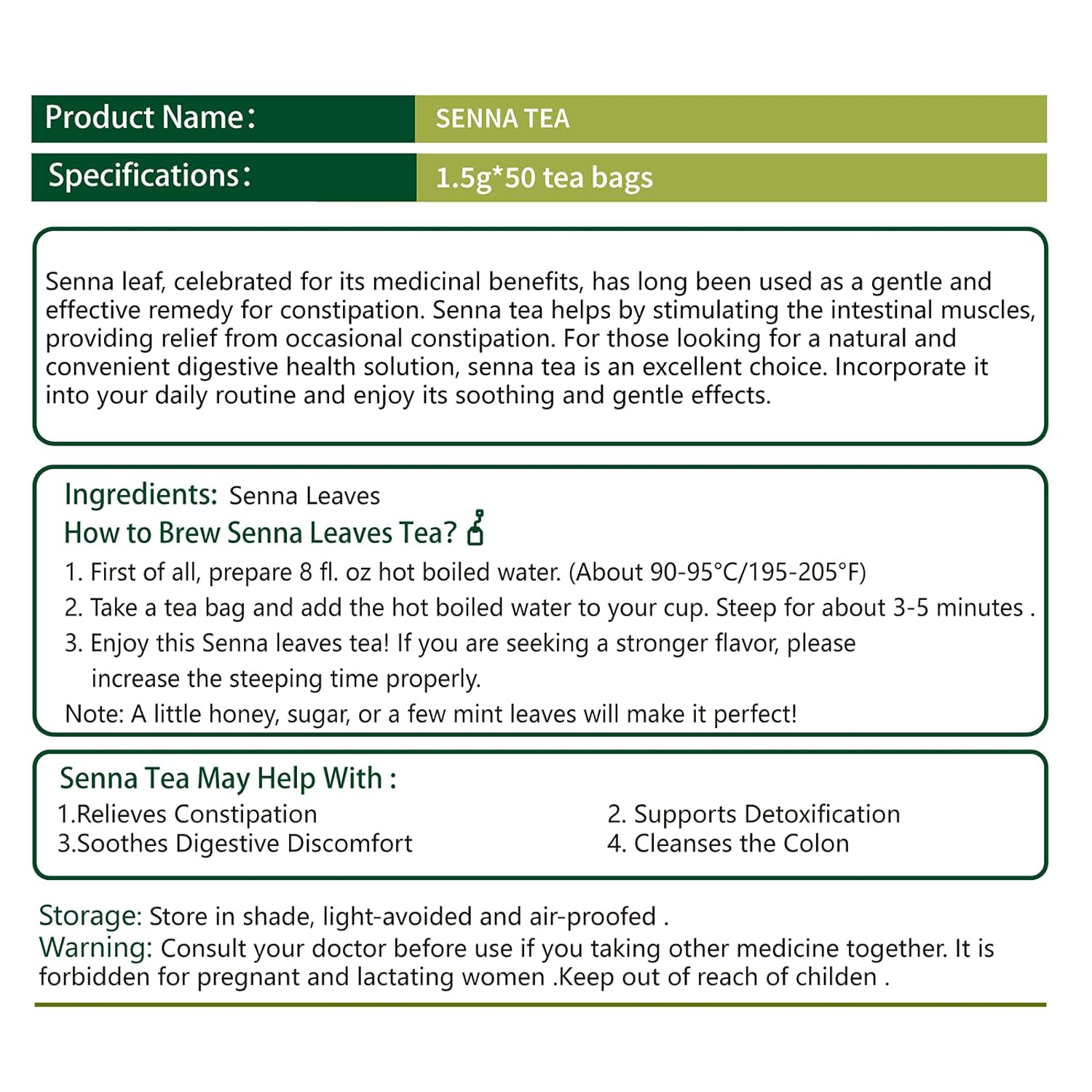 - 【Potential Benefits】: Senna tea helps with occasional constipation and is valued for its glycosides, which may offer a "relieving" effect. When consumed as directed, it gently supports bowel movements, easing discomfort and promoting regularity, making Senna tea a popular choice for laxative use and slimming