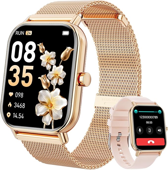 - 2 watch straps, 2 wearing styles: This smart watch for women men features a large screen design and comes with two interchangeable bands. The bright gold frame and gold stainless steel strap add a touch of elegance to any outfit. The smart watch for android phones offers a variety of built-in watch faces, or you can create your own personal photos. When paired with an iPhone, the Smart watch for iphone compatible allows you to use any photo, such as pictures of your family or pets.