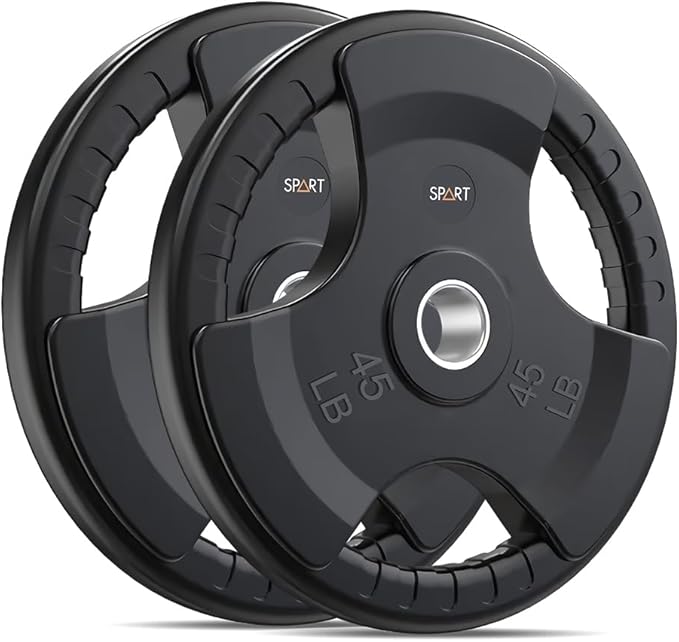 - 💪FEATURE: SPART weight plates have a solid iron core and slide rubber surface. This design can protect the floor from damage and ensure enough weight when you do exercise. The strong steel ring insert can help you assembly the barbell easily. The three holes are designed for grip according to your hands and you can do weightlifting exercise with single plate as well.