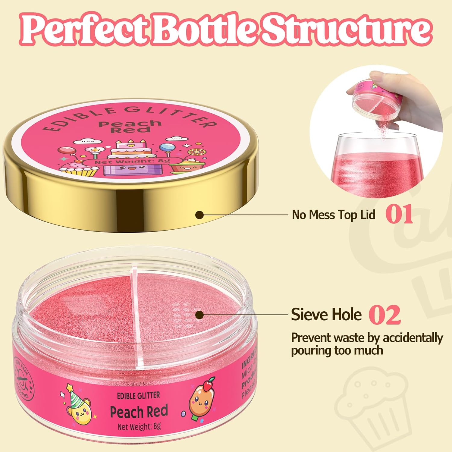- Easy to Use- Edible glitter is very easy to use and can be sprinkled directly on the food or drink to complete the decoration. Perfect sieve hole design prevent waste by accidently pouring too much. This product adheres very well to both wet and dry mediums. Attention: Seal and store glitter powder in a cool and dry place after use. Do not expose to excessive heat