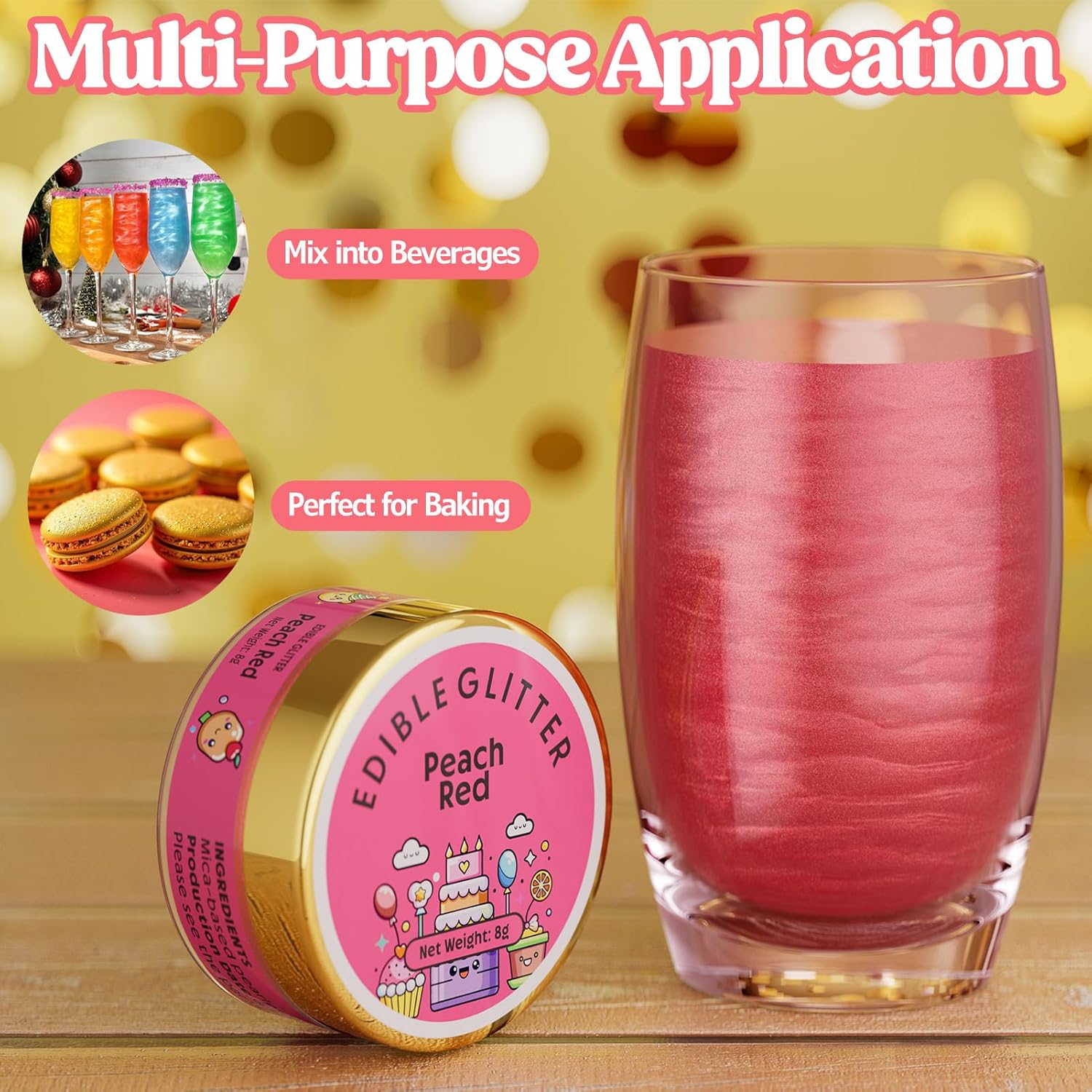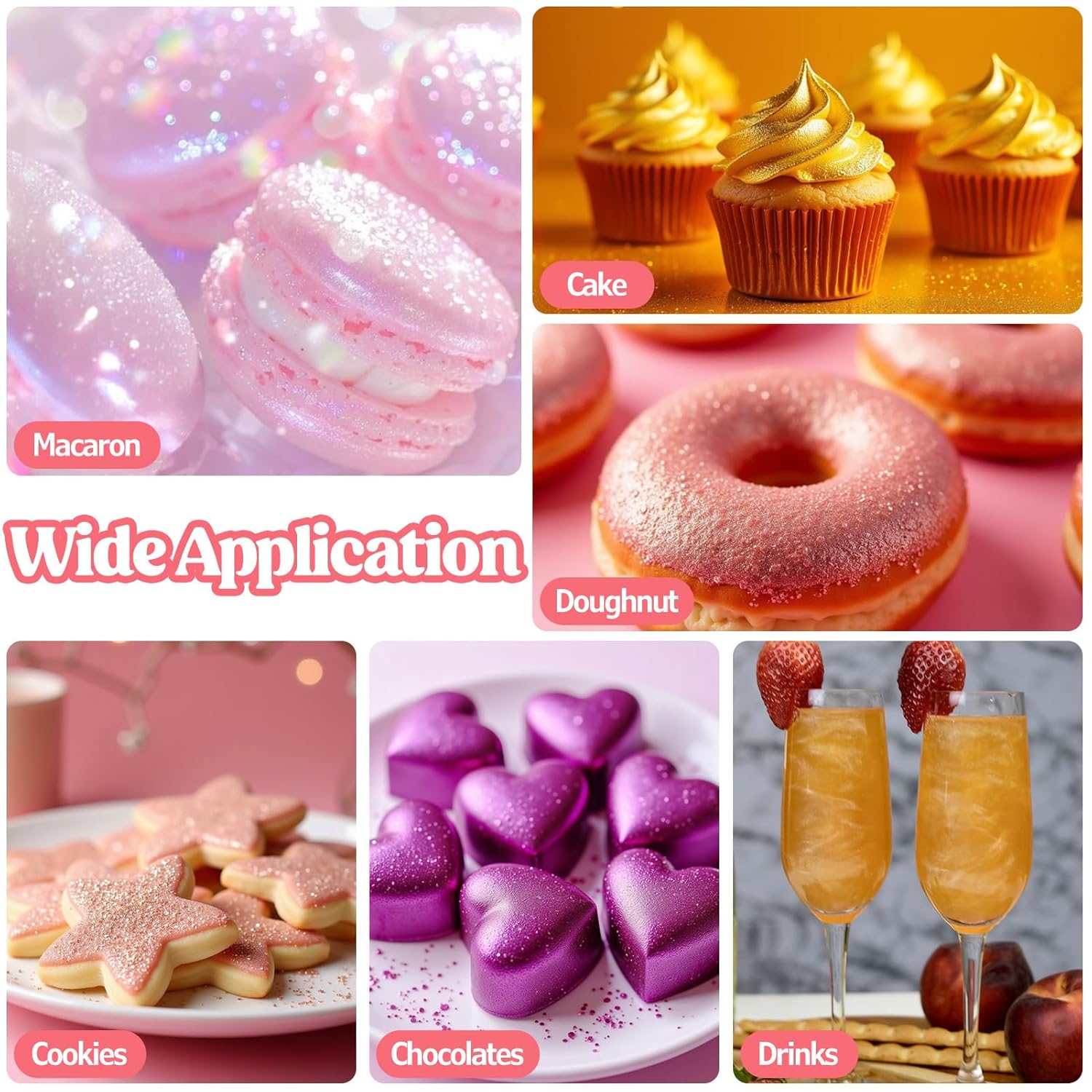 - Widely Used - This edible glitter is perfect for DIY wine, cocktails, champagne, drinks, beer, soda and more. it also can be sprinkled directly on the food, used to decorate cakes, cookies, chocolates, macarons, fruit platters, cupcakes, strawberries, lollipops, ice cream and more. It is also a great decoration for christmas, easter, halloween, thanksgiving, birthdays or any memorable holiday