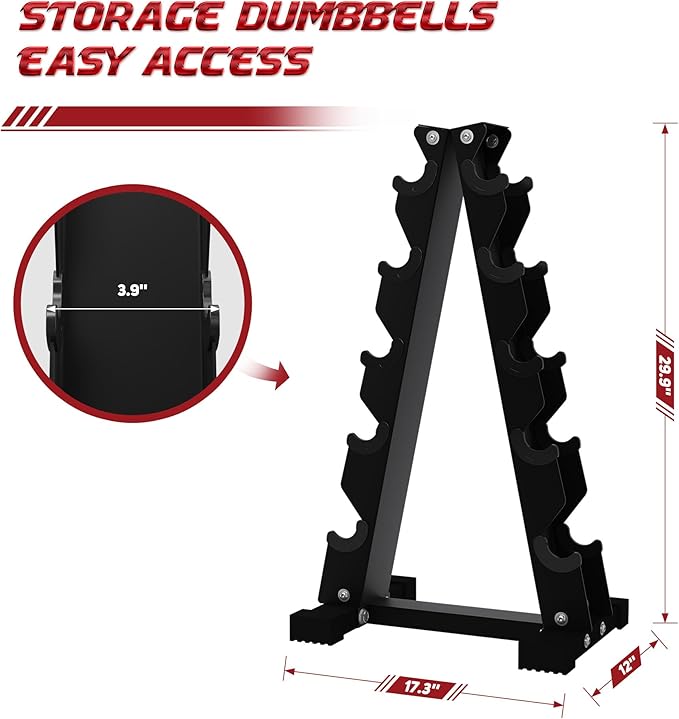 - 150 pounds set: 1x A-Frame rack (5-tier), pair of 5lbs, 10lbs, 15lbs, 20lbs and 25lbs